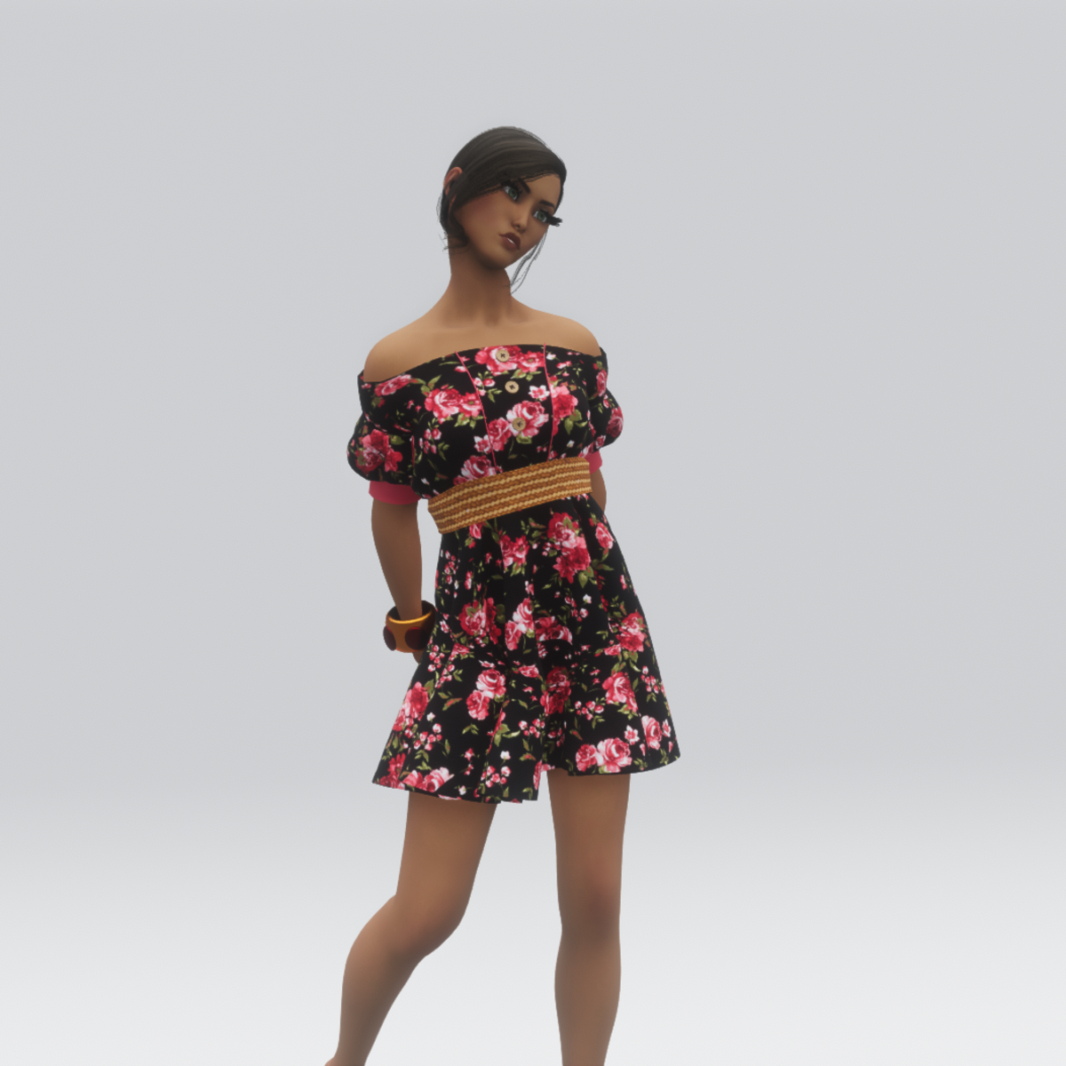 Do you love Bohemian dresses and skirts? Well this little number is for you. Yes you! Features Rose texture, buttons, puffed sleeves, above knee length and a cute belt. BANGLE AND HAIR NOT INCLUDED . IF YOU WANT THE BANGLE IT IS ON MY STORE. Thank you.