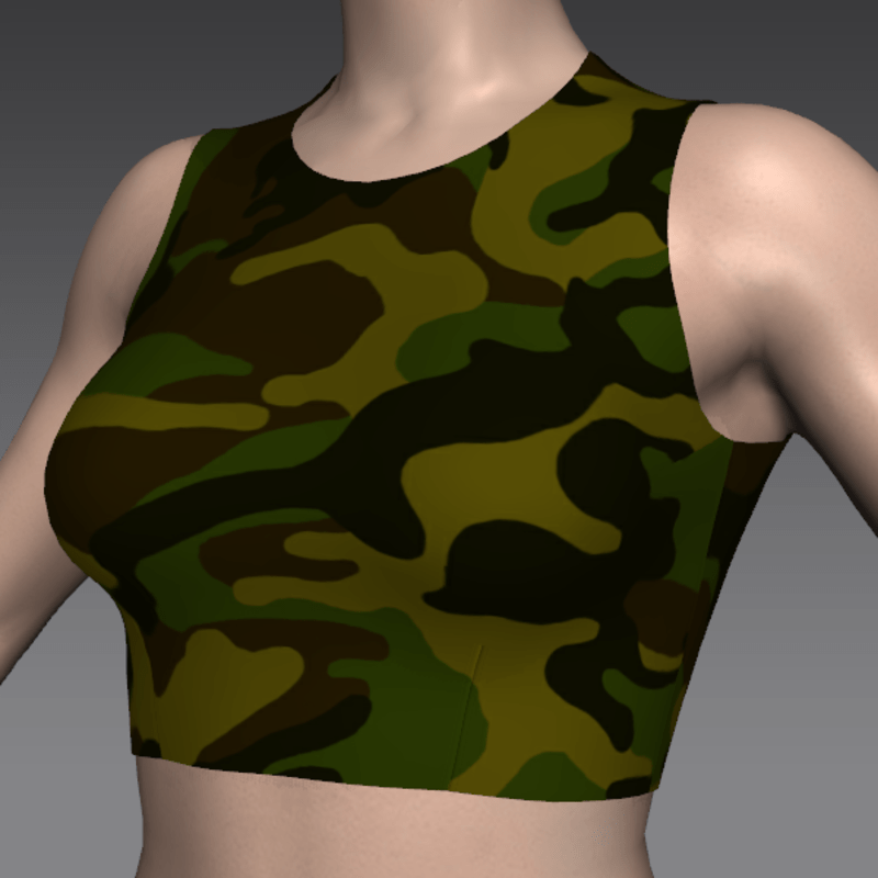 Fitted Camo Crop Top with Front, and side darting. Created with Marvelous Designer - Simulate cloth in the avatar editor to customize fit.