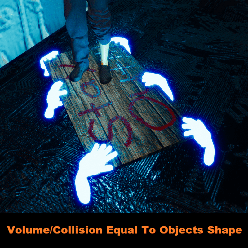 Sound Effects: When impacted/hit with a generic object - will play wood bang, followed by a ghostly sound effect - moaning and a "i see you" whisper. When walking on it plays walking on wood sound effect.