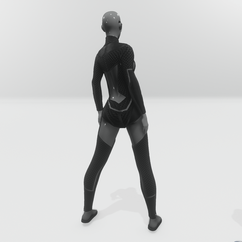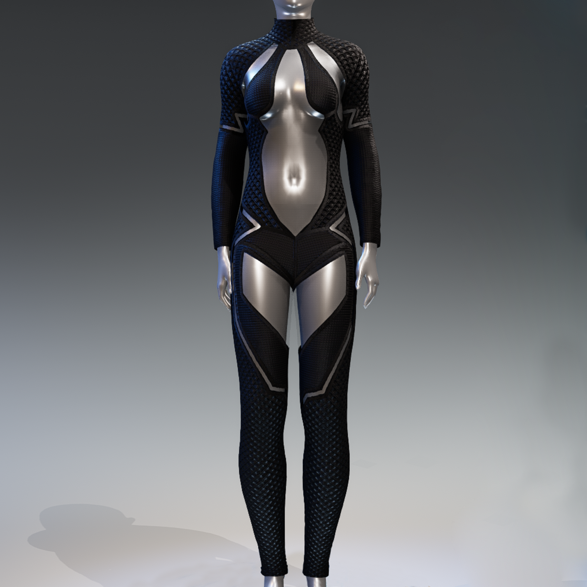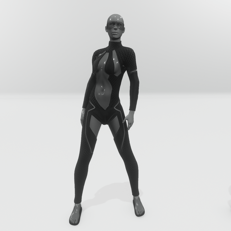Futuristic female jumpsuit, with large, plastic like, high transparent areas. It has long sleeves and mock turtleneck. Black color. Get the free demo item to check fit and style before purchasing here: https://store.sansar.com/listings/89a0defa-80b5-4282-a3d5-f5d807904673/baryt-jumpsuit---demo