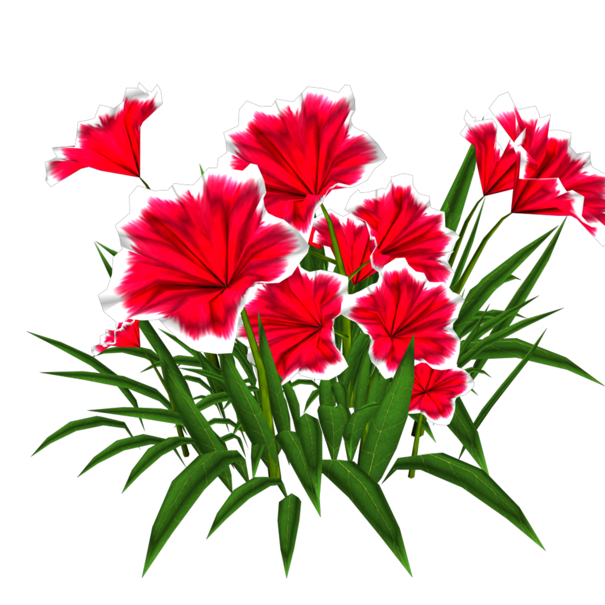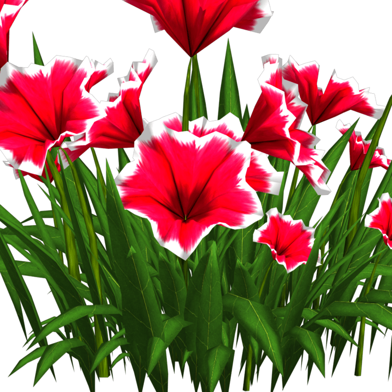Petunias. I made many colors. There is no collision on this mesh so you can walk through it. To see it in Atlas, please visit "LovedWarrior's Ground Plants: https://atlas.sansar.com/experiences/lovedwarrior/lovedwarrior-s-ground-plants" Each petal, pollen, stalk and leaf is made by hand and placed by hand. All the textures are also made by me. Enjoy!