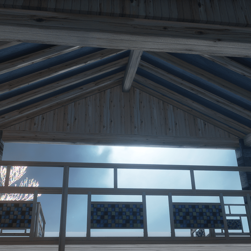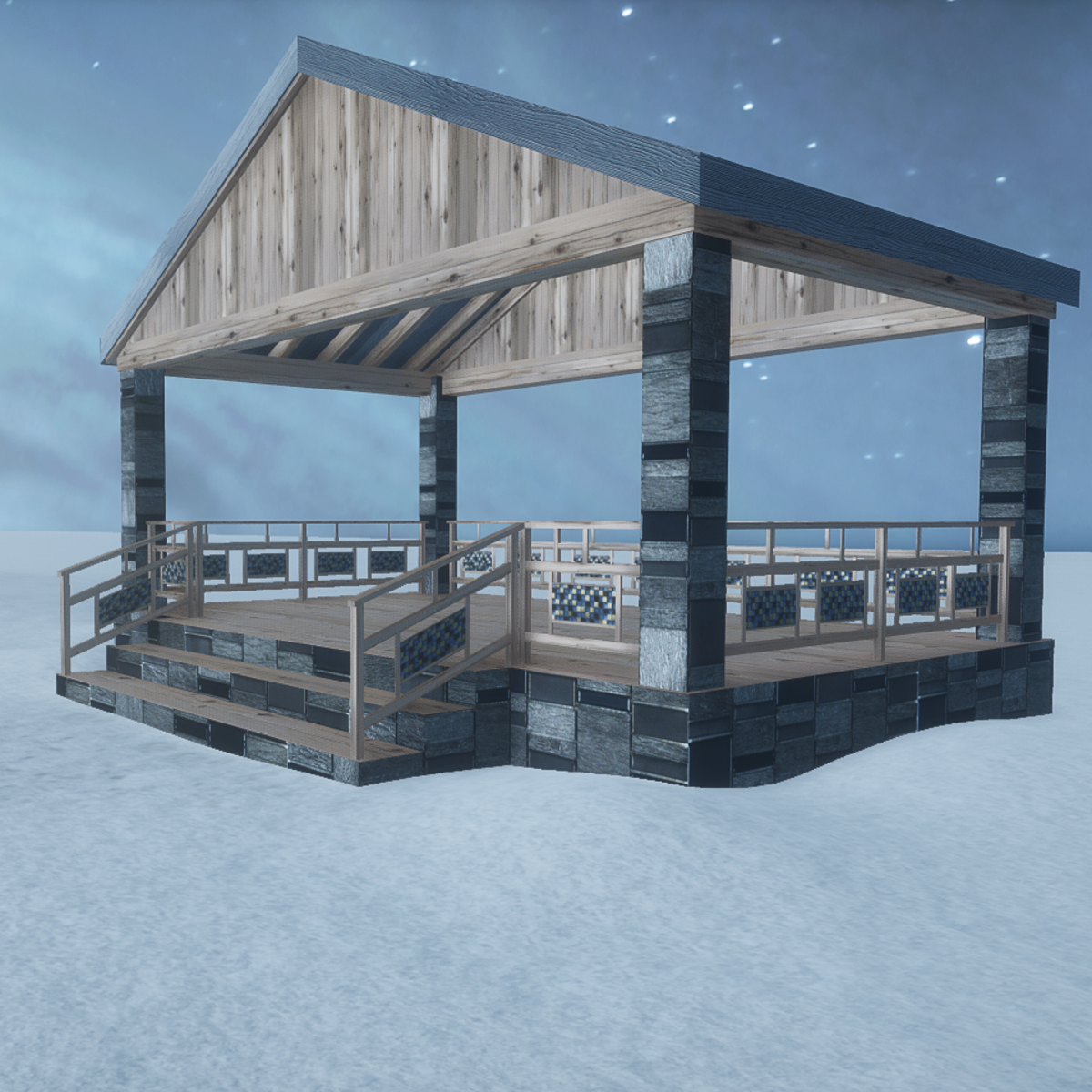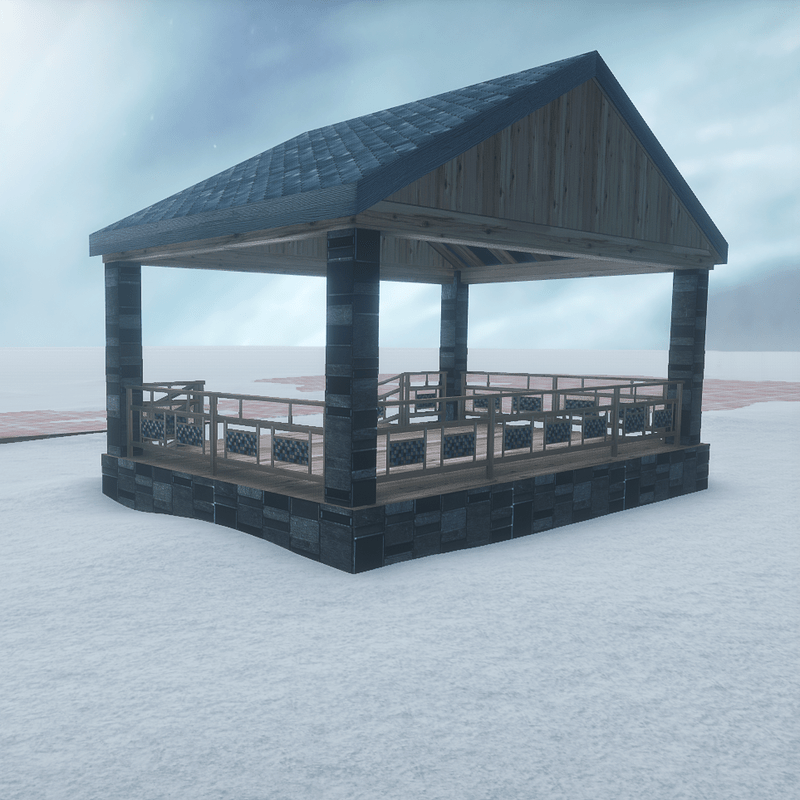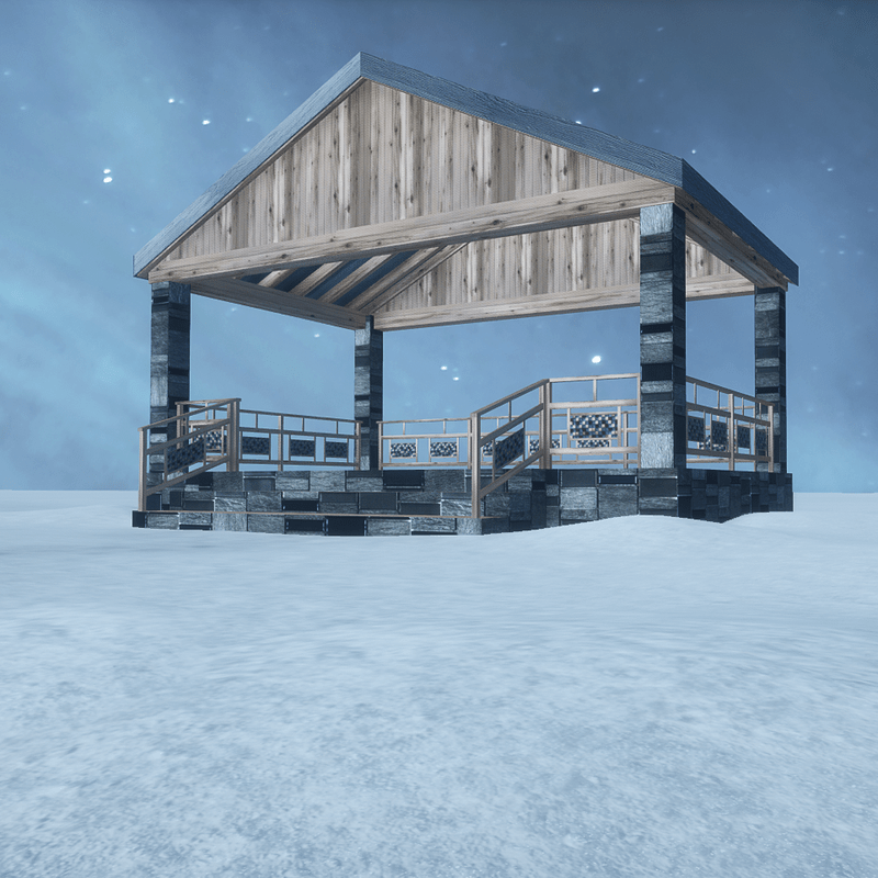 A rectangle pavilion made with natural wood and stones. A big garden raised kiosk, with stairs and railings. With collision. You can check it here: https://atlas.sansar.com/experiences/luise/terra-di-luci