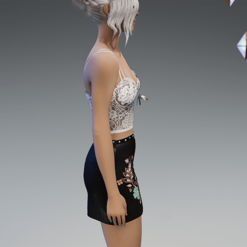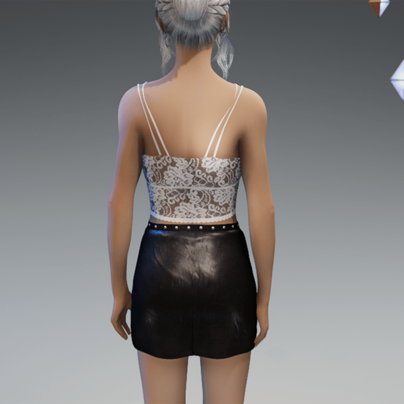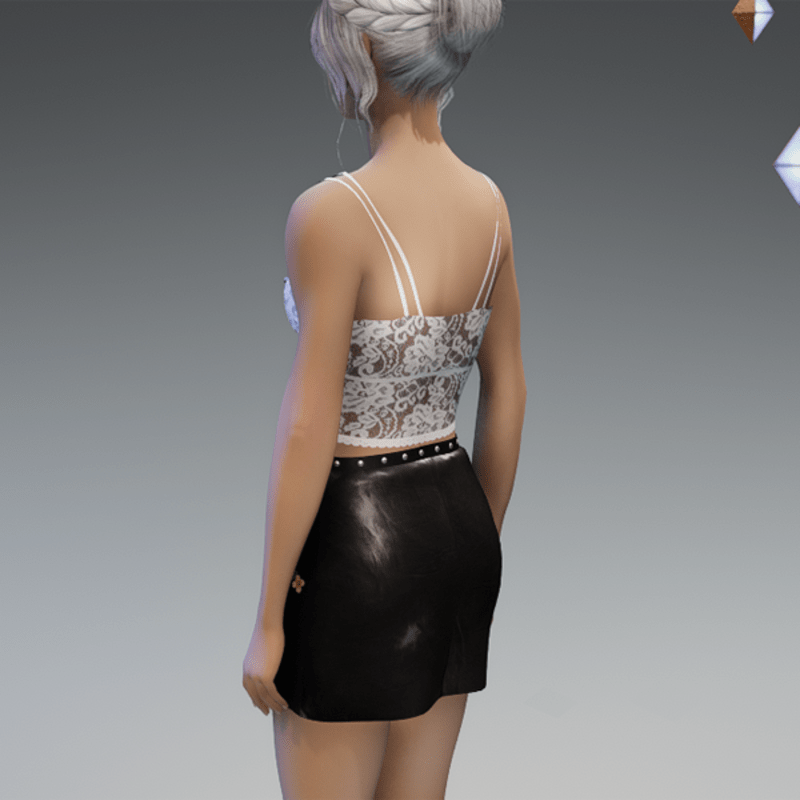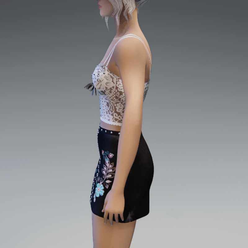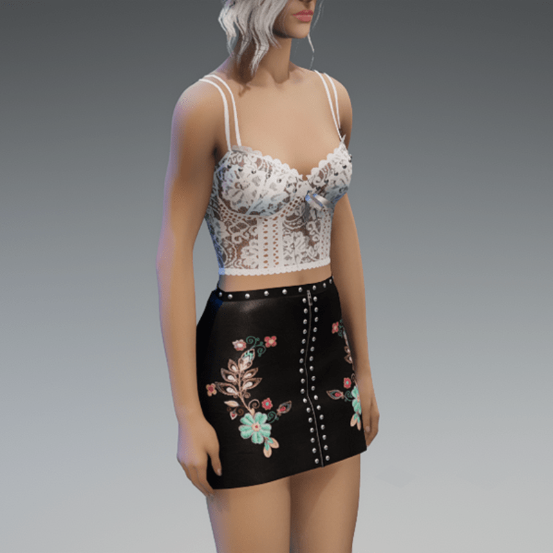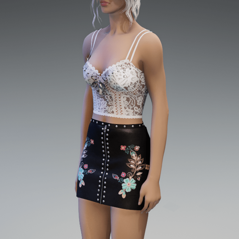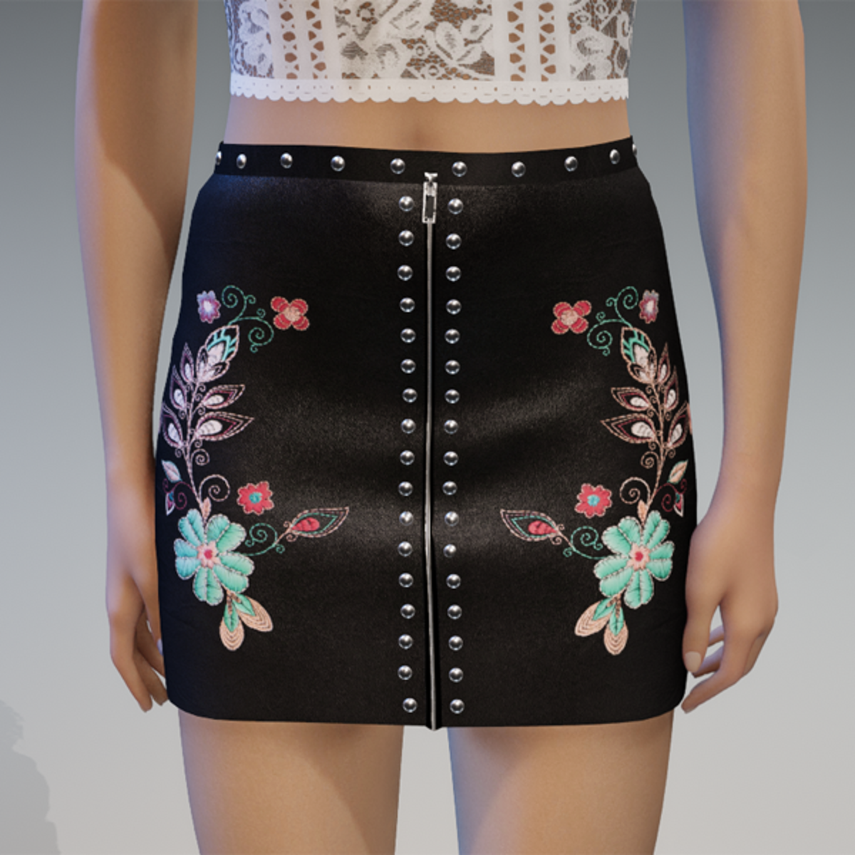 this leather skirt comes with the blue flowers patches on the front as well as some rivets and a zipper. Enjoy! <3