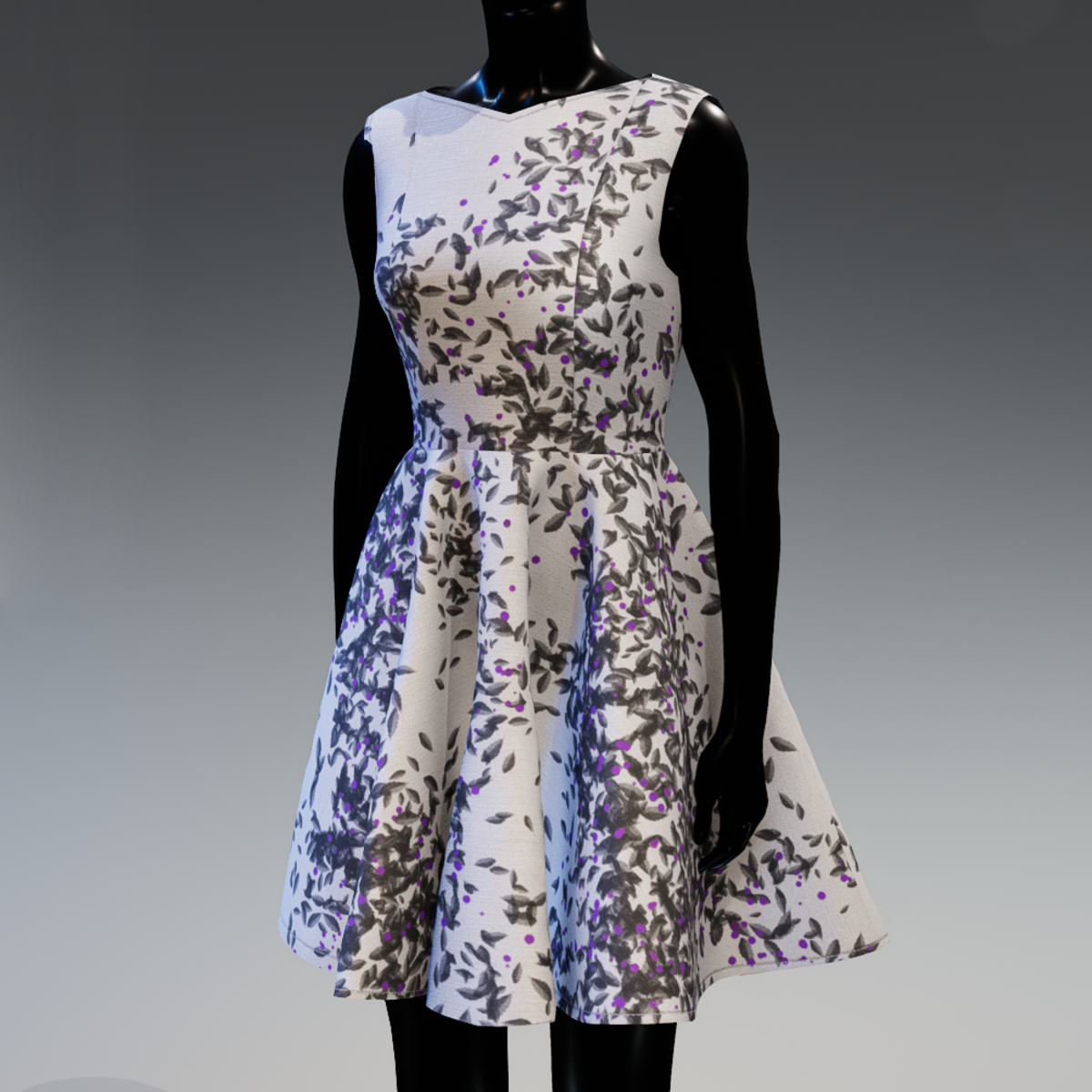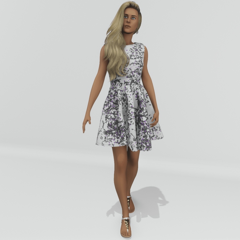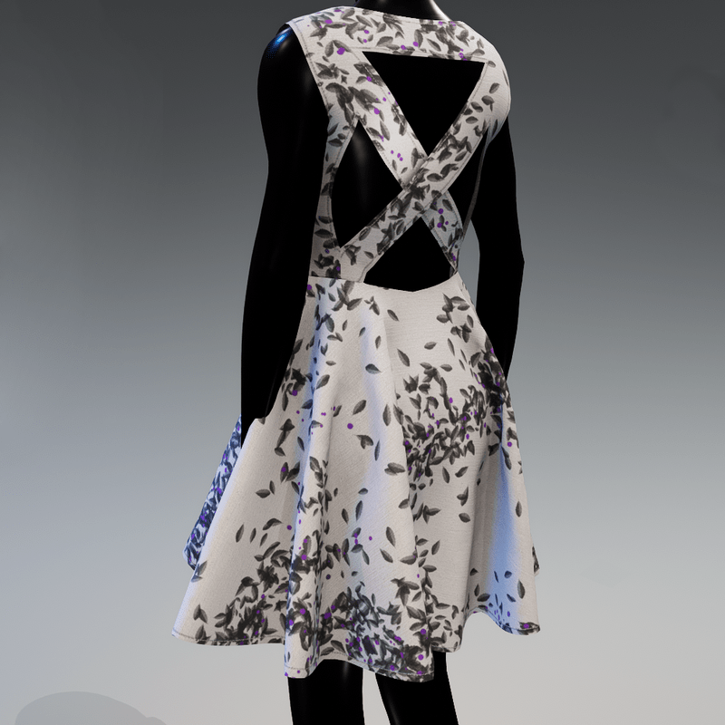 Casual, a-line, sleeveless mini dress for the spring and the summer. The back is open and the fabric is printed with abstract pattern. In white and grey colour.