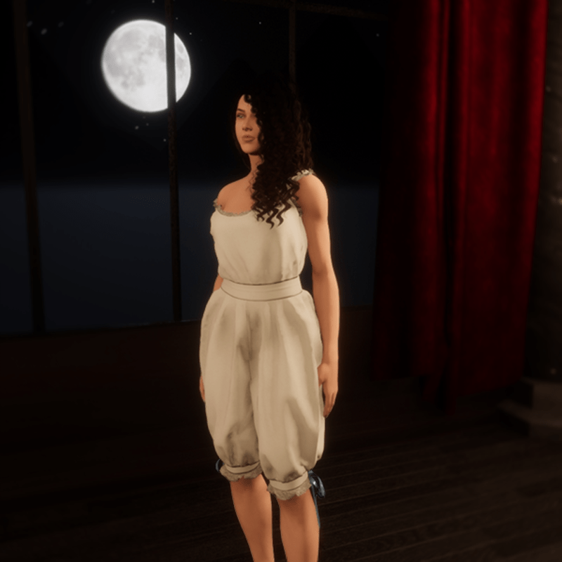 One-piece chemise and drawers undergarment. Based on Late-Victorian patterns, this piece is a loose-fitting cotton garment with blue silk ribbon details and an eyelet lace trim. This is a Marvelous Designer garment so you can adjust the leg slack as well as choose to pull a shoulder down to reveal a little more décolletage. I suggest "adjusting" this garment once it's on your avatar to fix any skin overlap or fabric sticking together.