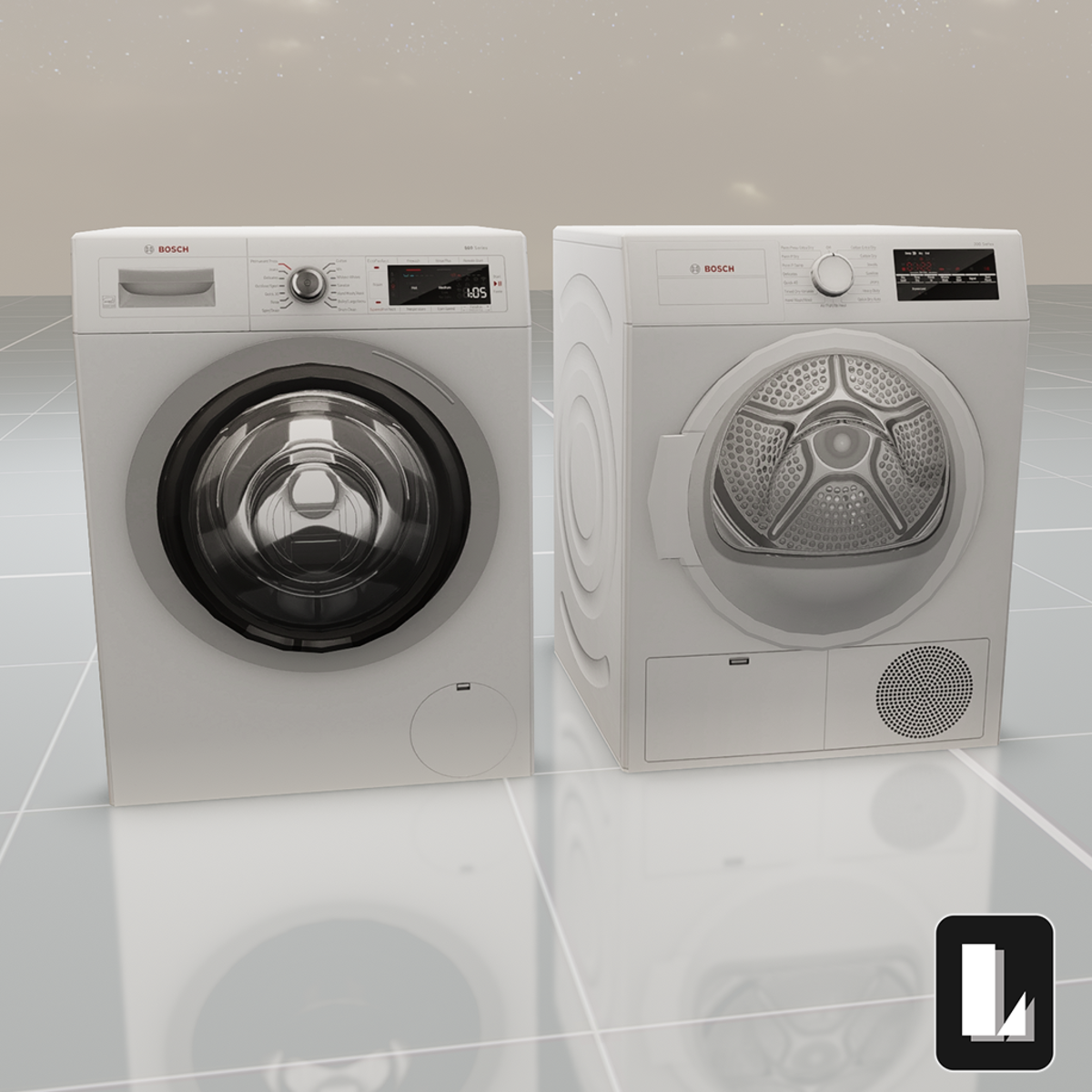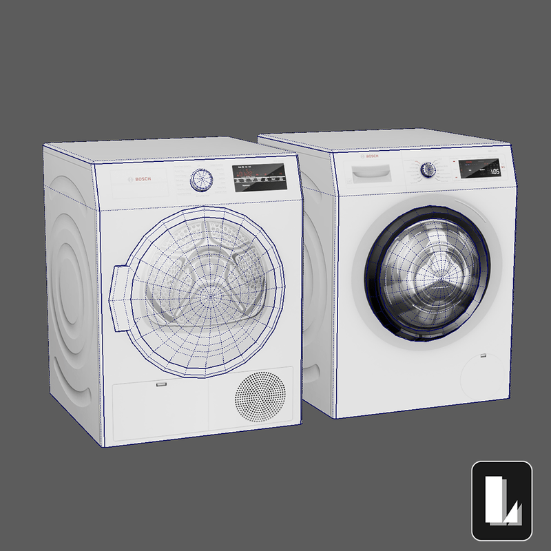 Low Poly Washer/Dryer set. This collection has a total of: ⦁ 1240 Polys ⦁ 695 Verts ⦁ No overlapping UVs ⦁ No Collision Mesh