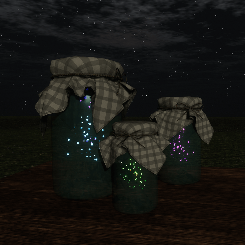 1 Cosy Fairy/Firefly Jar. 3 animated swarms inside. Re-sizeable, place in a group for the most magical result. Colors of the 3 fairy/fly swarms can be changed separately in the materials tab. See in world to watch the animation. Store Link: https://atlas.sansar.com/experiences/bluebell/bluebell-home-garden-wip