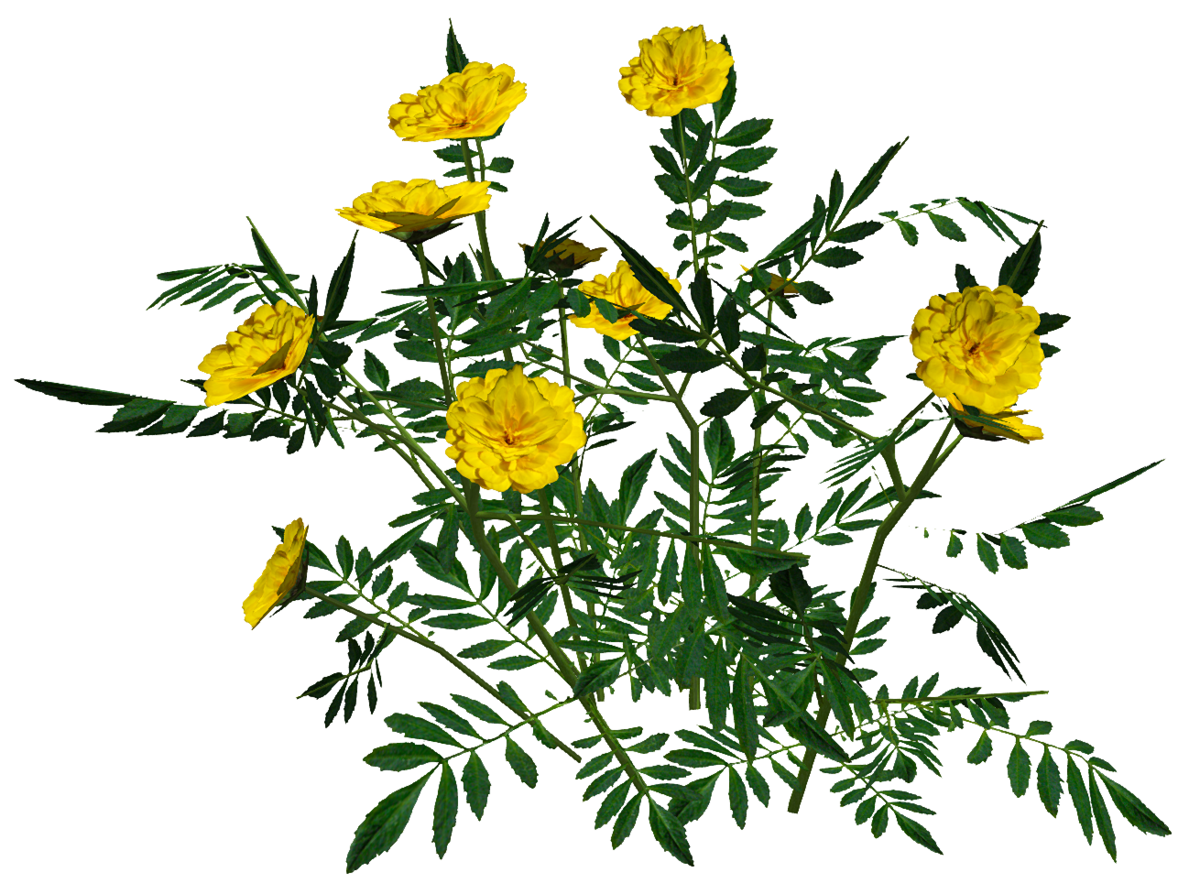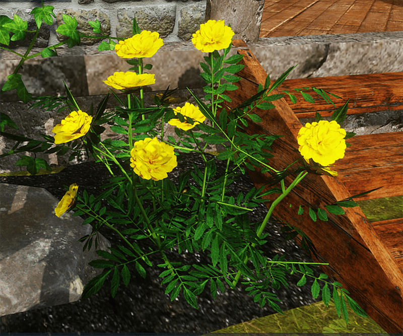A marigold bush. This object is made up of mainly planes with images of leaves and flowers, with solid stems. See in Sansar experience - https://atlas.sansar.com/experiences/reidparkin/reid-s-plants 1713 triangles