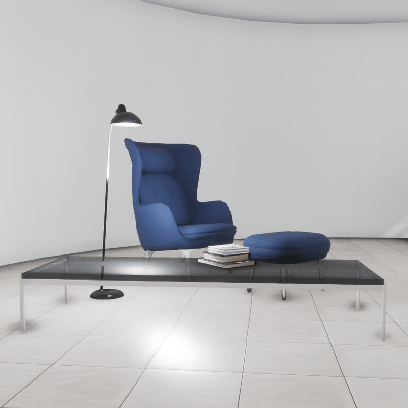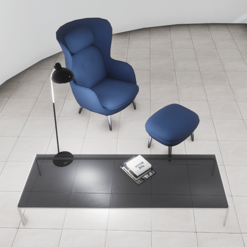 A classic furniture set that includes: - A blue and silver lounge chair (has collision) - A matching stool (has collision) - A coffee table with wood and glass materials (has collision) - A floor lamp with point light (no collision) - A stack of books (no collision) All items are editable. You can take a closer look here: https://atlas.sansar.com/experiences/luise/studio-lamda