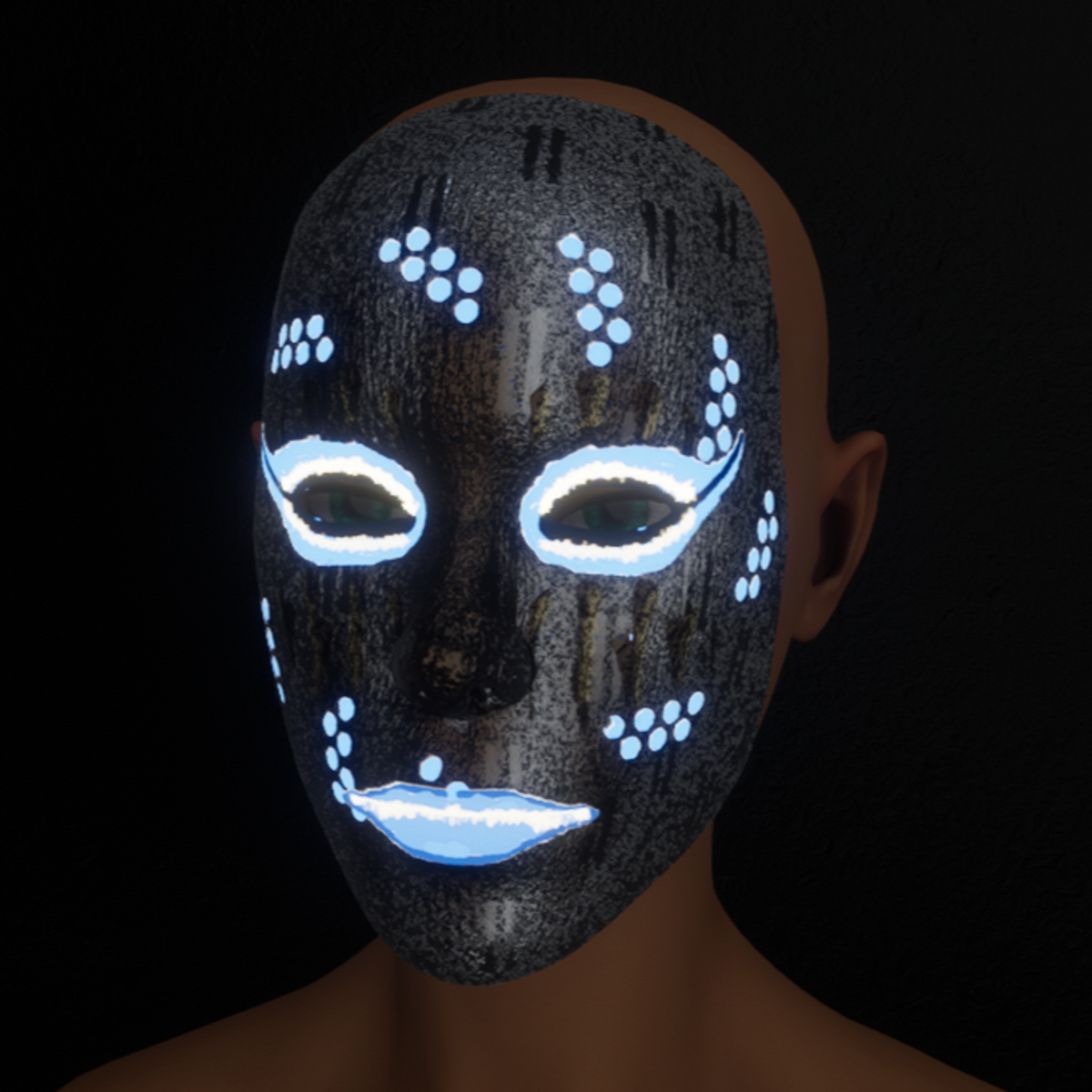 Glow in the Dark Facie Blue can be worn on any avatar. SEE other FREE #Golden Halloween Mask# IN MY STORE. Just see all my items in my experience: https://atlas.sansar.com/experiences/acpixl/acpixl-animation-avatar-store