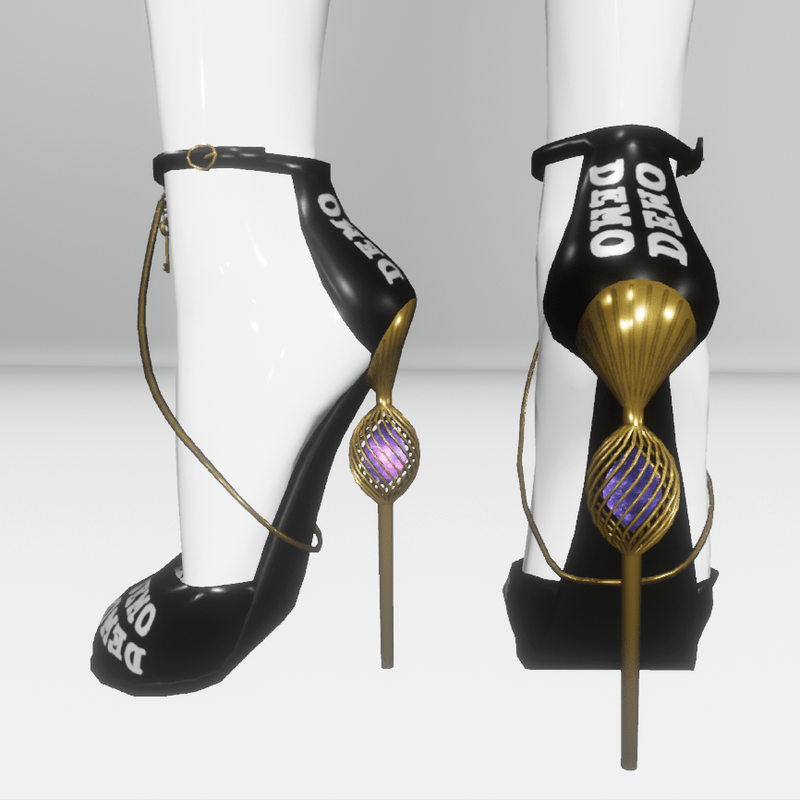 Stiletto sandals for the system H2AI high made of leather and metal. The heel is shaped like a cage enclosing a small galaxy, which rotates. The shoes are tied at the ankle with a strap and a buckle. At the front hangs a small key and a metal chain that surrounds the foot. Free demo item