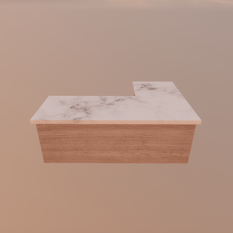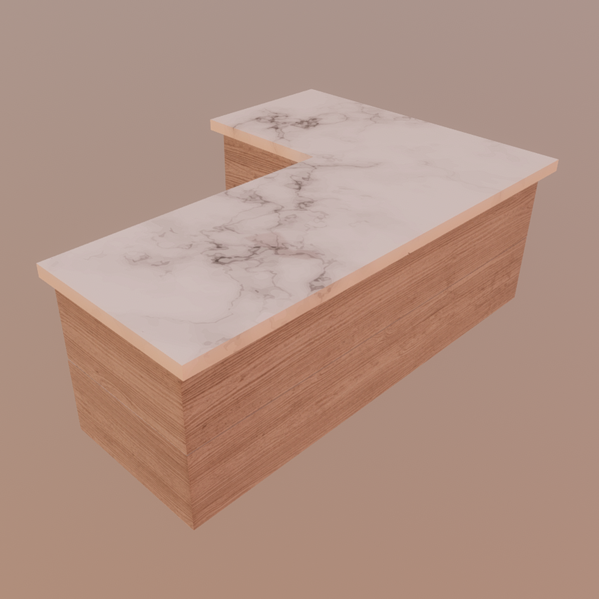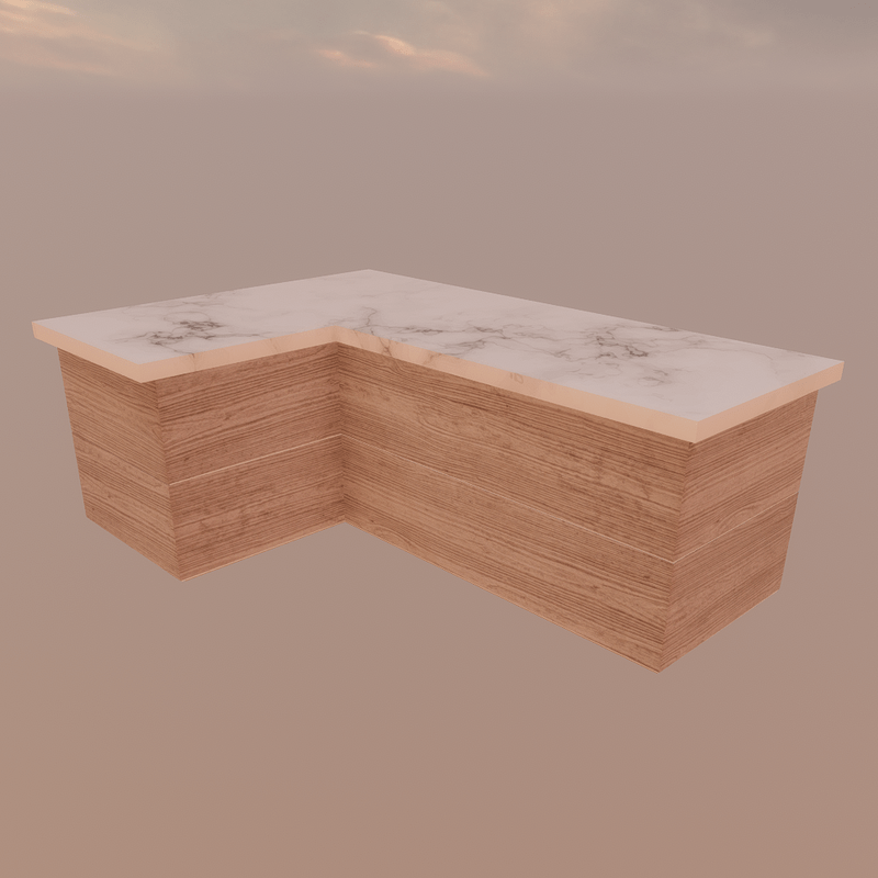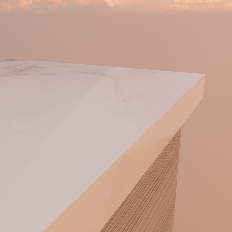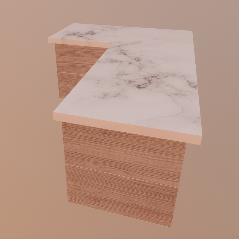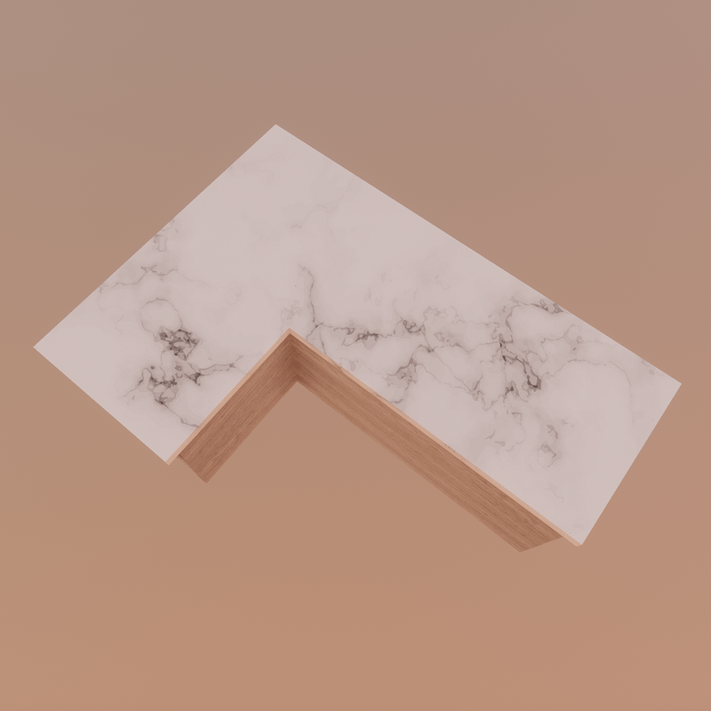 Modern and luxurious angled kitchen counter in marble and light wood, perfect for modern homes. High quality 4K texture. Cool design.