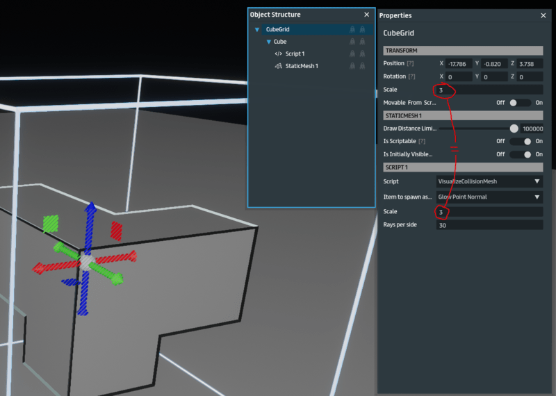 This cube creates a visualization of the collision shapes during runtime of your world. It is mainly intended to debug collision shapes attached to bones. 1. Align the box position and size in the editor, such that it covers your object. 2. If you change the size by tuning the scale parameter in the transform properties, then enter the same value also as the scale parameter in the script properties (see screenshot). 3. If your object inside the box is animated, don't start the animation automatically by setting the animation property "Begin On Load" to OFF. 4. Build and enter your world. The white frame of the box will be hidden, instead a grid of red dots will appear. Depending on the number of rays configured on each side this may take a while (approx. 1 min for 30 rays per side). The script attached to the box is generating a grid on each face of the cube. Then a ray is cast to the opposite point to detect any collision shape on the path. If a collision is detected, a red dot is spawned at that position. If your scene has changed during runtime, you can retrigger the algorithm by typing "/castrays" in the nearby chat.