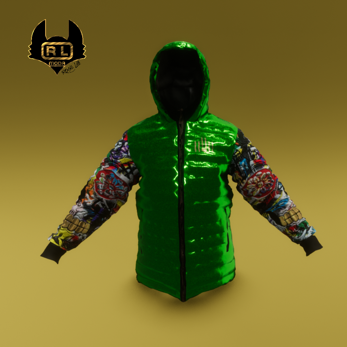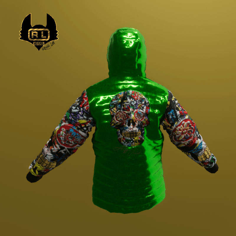 R.L.SKULL MURALES LATEX/VERDE ZIP- OPEN / CLOSED JACKET YOU CAN ALSO SEE EVERY ITEM IN 3D, IN THE ROYAL LAB SANSAR STORE https://atlas.sansar.com/experiences/alfy/royal-lab THE ROYAL LAB SANSAR, IS A VIRTUAL STORE, AS WE HAVE WORKED IN THE TEXTILE FIELD FOR MANY YEARS, WE HAVE DECIDED TO CREATE A VIRTUAL STORE ALL DEDICATED TO SANSAR, WITH ITEMS TO BE TESTED FOR FUTURE SALES IN REALIFE