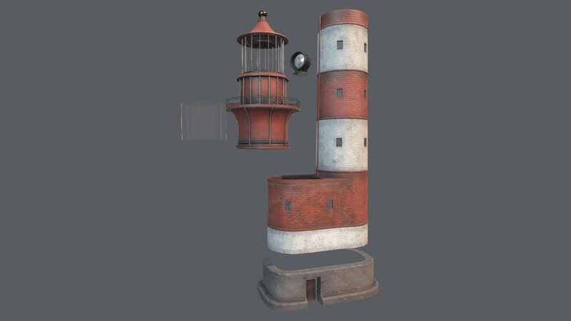 Very Detailed Huge Old Lighthouse with High-Quality Texturing Made to be used for Exterior Decoration in landscapes, or as a landmark. The lighthouse has great details to it, such as Windows in the top, a Big Lamp, old rusty steel railing, windows, and metal door as an entrance. The Lighthouse is separated into pieces, such as the stone fundament in the bottom which can be removed if not needed and such, see the screenshot for separated pieces. Lamp can be rotated with its pivot centered for perfect rotation, animation could be added to it. The Model Uses 2 X 4096x4096 Albedo, Roughness, Metallic, Normal maps to keep a Good Resolution Glass in the top of the lighthouse uses Alpha map for glass effect. The Mesh is unwrapped, and UV Mapped PBR Painted