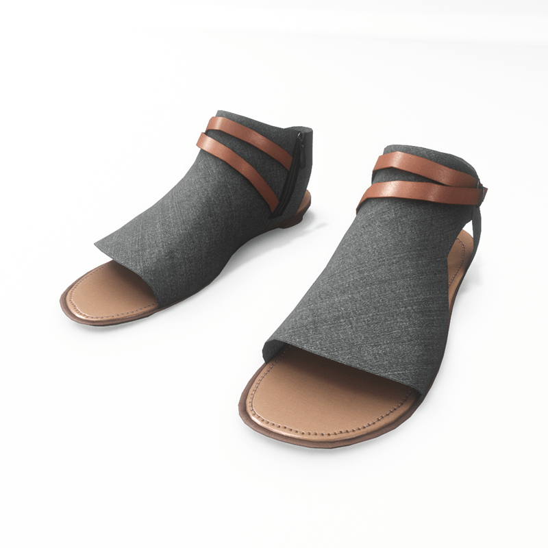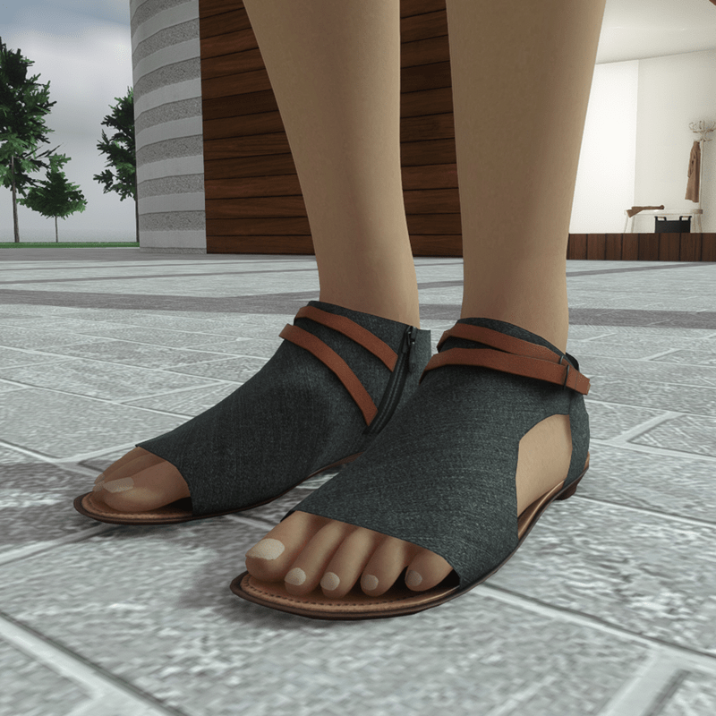 A modern pair of flat sandals made with grey denim fabric. The shoes have an inside zipper closure and decorative leather straps around the ankle. Get the free demo to check style and fitness before purchasing here: https://store.sansar.com/listings/068ce114-0610-4487-8dcf-405b6ba01511/av-20---open-toe-textile-sandals---demo