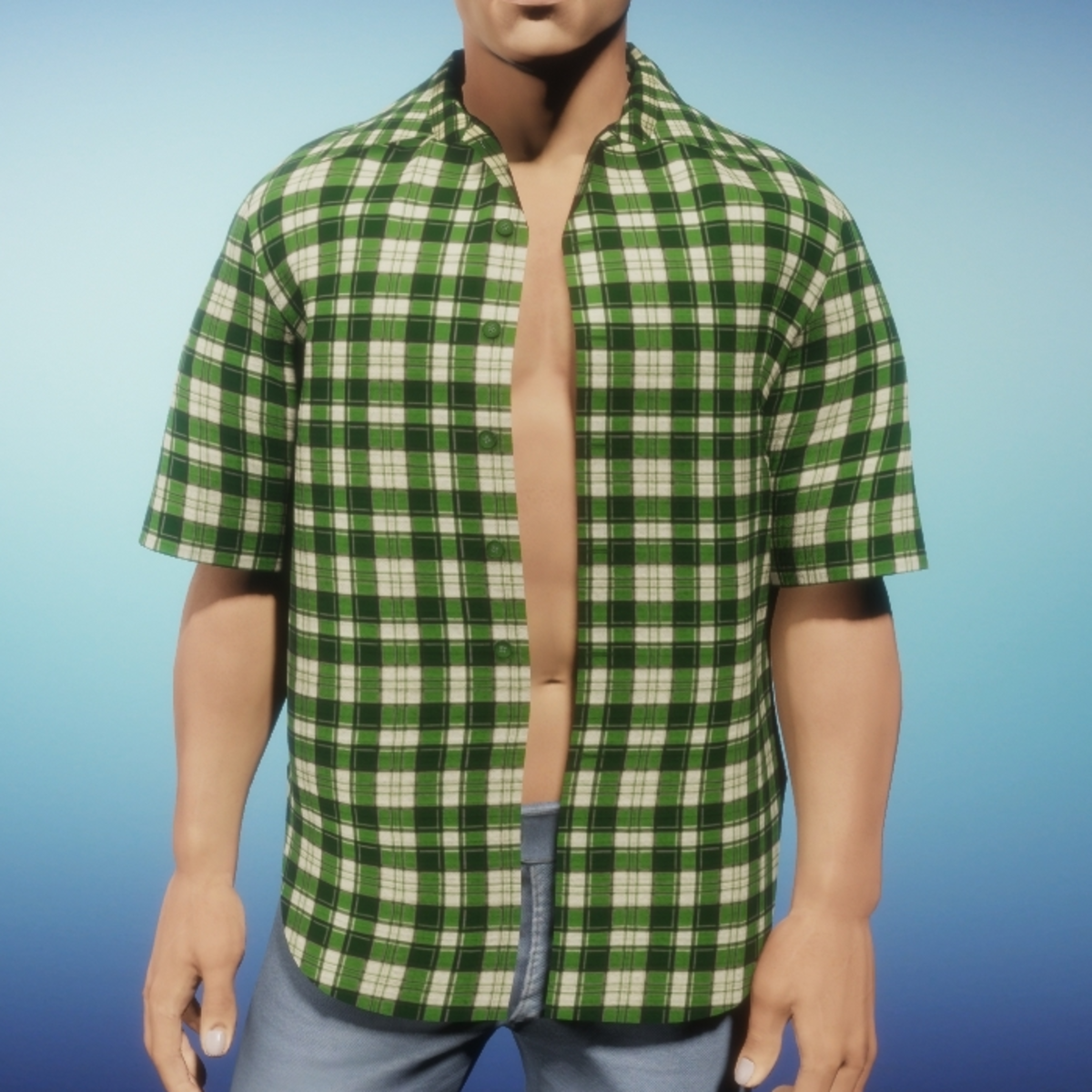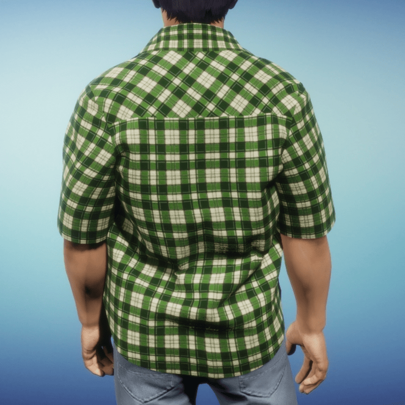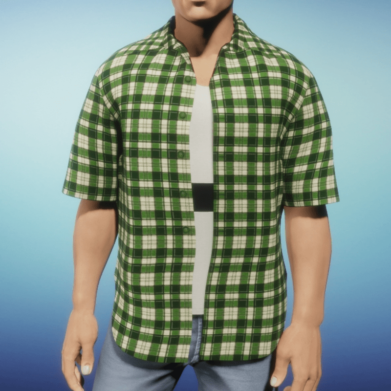 Unbuttoned short sleeve shirt for men in green plaid. Please be sure to hit the simulate button in the lookbook when wearing any clothing made in Marvelous Designer. This much improves the fit as well as gives you the chance to push the fabric around to your liking. It is advised to not wear hair until you have completed the simulate process. Styling - Shown in pic worn over the Mens Color Block Tank - black and white Tips for layering with this shirt. Dress the opposite of how you would in the physical world. Instead of starting on the closest to the body and working your way out .. undies -> jacket .. do the opposite .. start with the outermost layer and work your way inward. First, remove any hair you might be wearing, wear the shirt and hit the simulate button, let it settle down then add the undershirt of your choice and let it simulate. At first it may look as though it's not going to work but give it time and it should settle down. If it doesn't work the first time and one piece starts to "eat" the other, take everything off and try again. It will work!