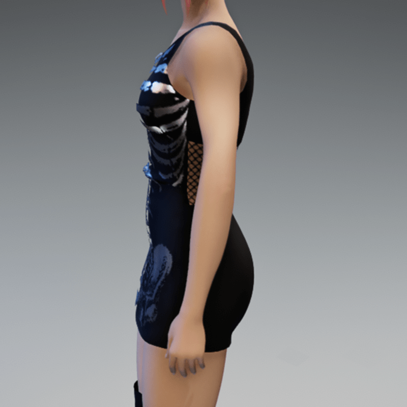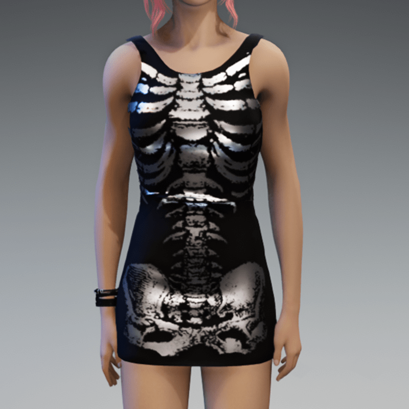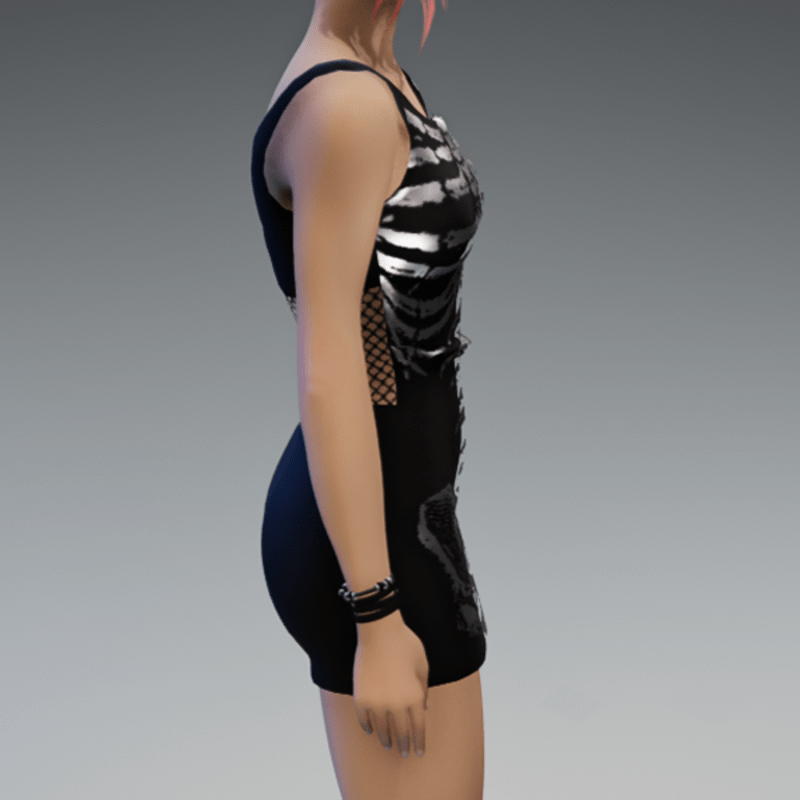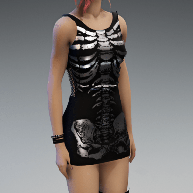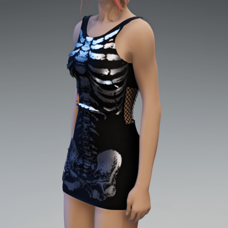 Another skeleton-mini-dress which comes with a fishnet-detail on the back and a silver shiny skeleton-fabric on the front. Enjoy!