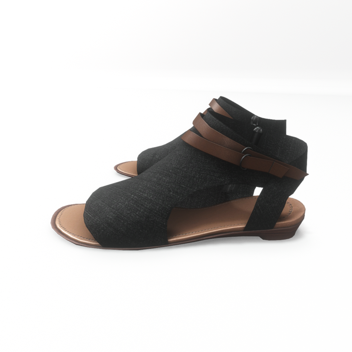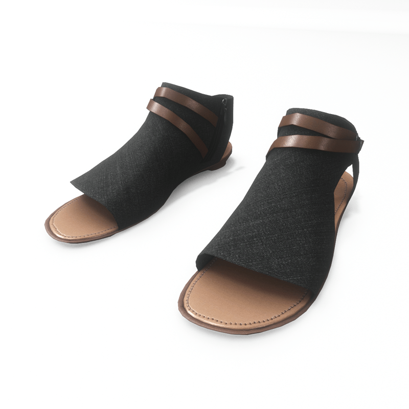 A modern pair of flat sandals made with black denim fabric. The shoes have an inside zipper closure and decorative leather straps around the ankle. Get the free demo to check style and fitness before purchasing here: https://store.sansar.com/listings/068ce114-0610-4487-8dcf-405b6ba01511/av-20---open-toe-textile-sandals---demo