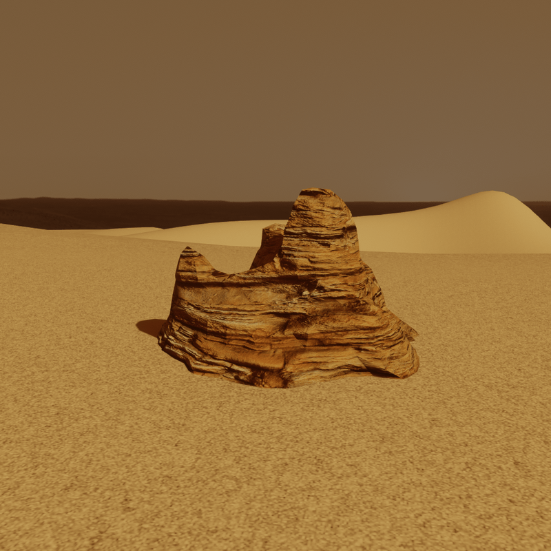 Desert rock measuring about 2.8 x 2.2 x 1.6 meters. Contains a normal map for a more differentiated representation of the surface.