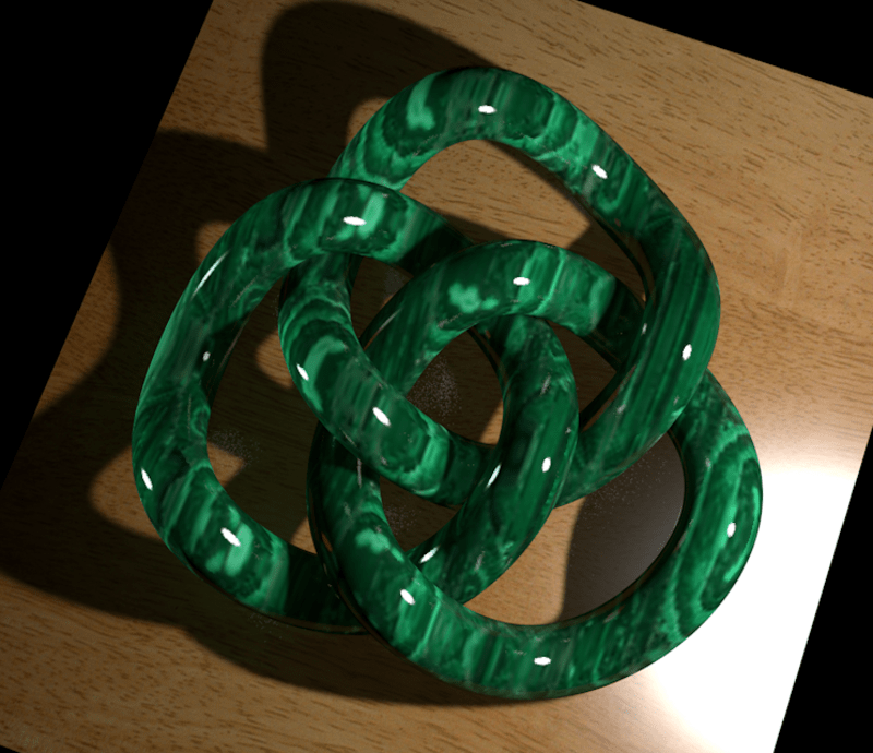 An interesting artpiece, suitable for tabletop as room decor. An intriguing "Borromean rings" knot carved from green African malachite.