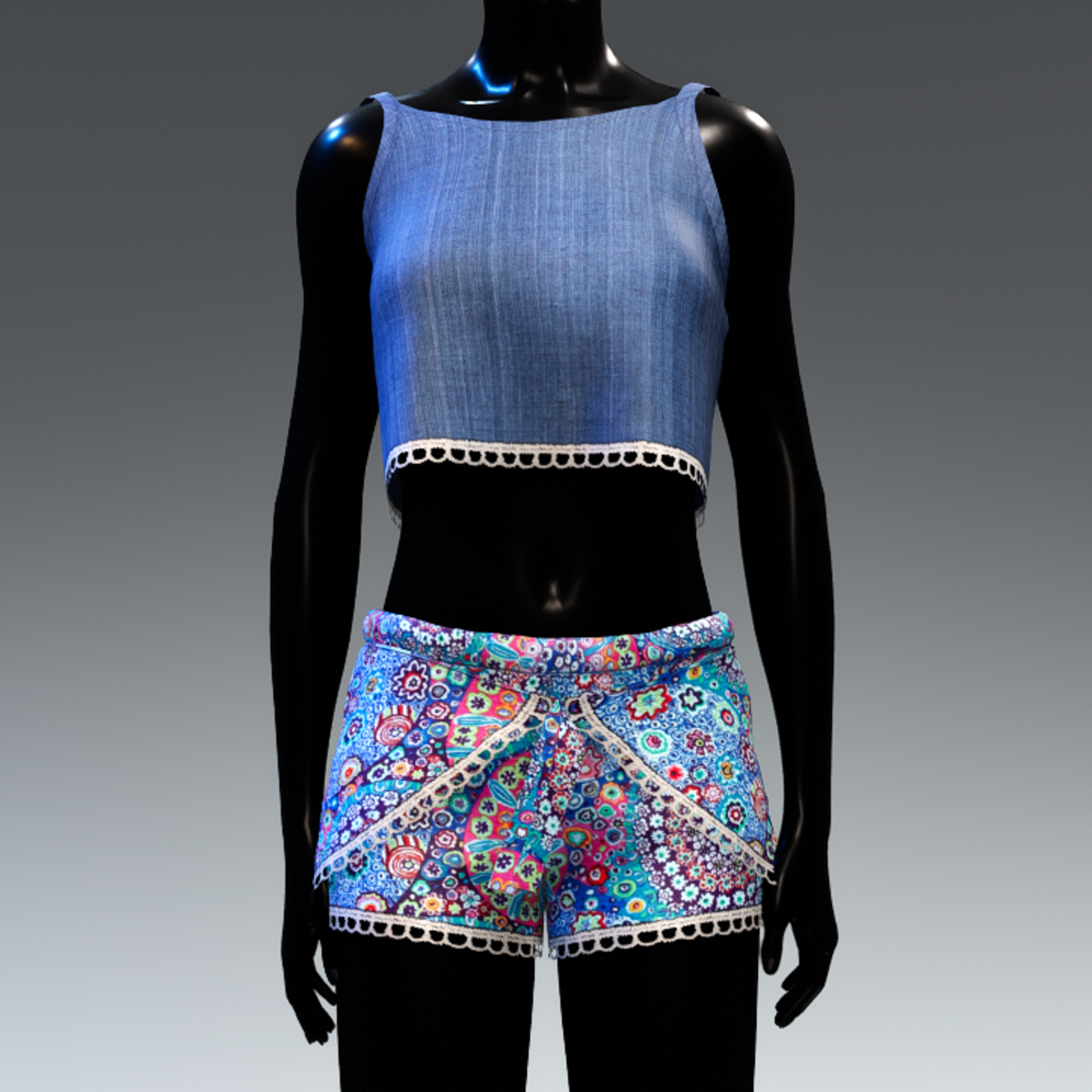 A beautiful cute, casual, summer set in blue colour. The shorts is made with multicoloured bohemian fabric and has a double front side. The strap top is short and plain colour. Both are decorated with a white lace trim.