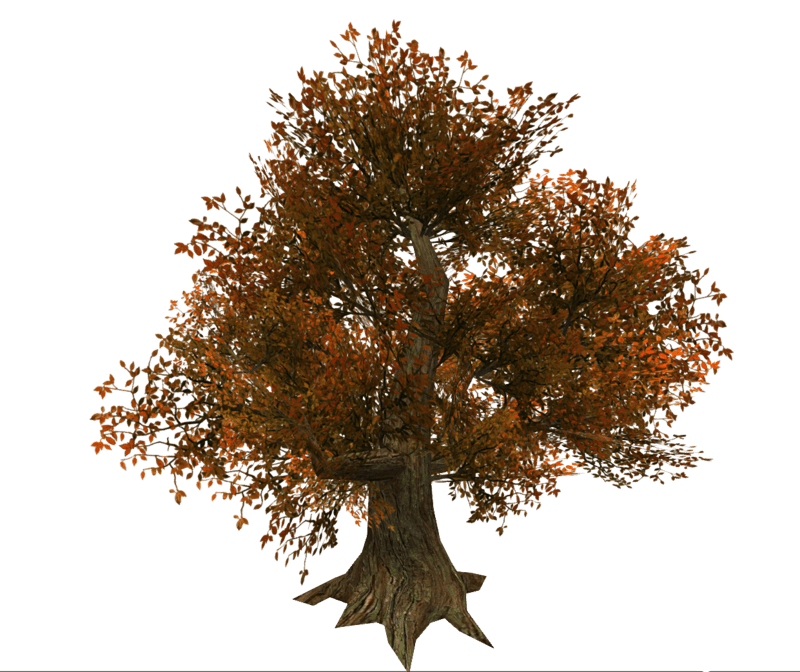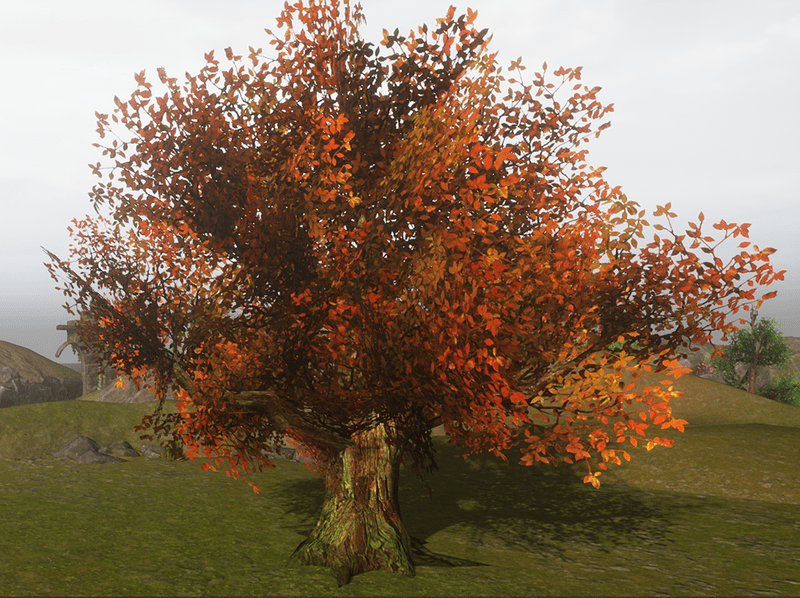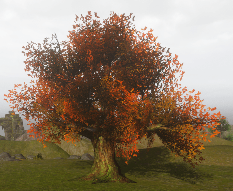A large wide copper tree. Trunk is solid mesh. Leaves and branches are images on flat planes. 749 triangles. See in Sansar experience - https://atlas.sansar.com/experiences/reidparkin/reid-s-plants