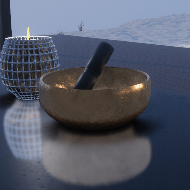 Tibetan singing bowl for meditation or to use as a decorative element. Calms anxiety and regenerates the soul. Sound added. You can test it in my world https://atlas.sansar.com/experiences/nenits-6733/still-waters-retreat