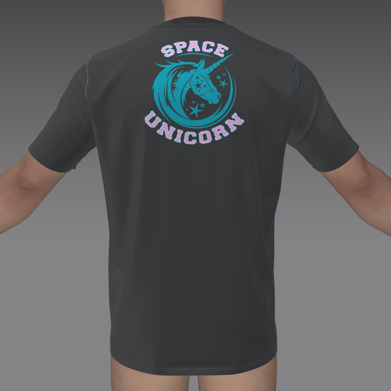 DJ Puddles T-Shirt. Grey. Adjustable. 'DJ Puddles' motif on front, 'Space Unicorn' motif on back.