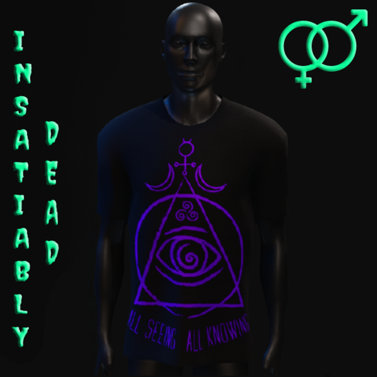 FOR ALL THE GHOULS AND GALS. UNISEX "ALL SEEING ALL KNOWING" T-SHIRT [BLACK/PURPLE]. CREATED IN MARVELOUS DESIGNER WITH AVATAR 2.0. ADJUSTMENT MAY BE REQUIRED! FITTING INSTRUCTIONS CAN BE FOUND BY GOING TO THE LINK BELOW. https://help.sansar.com/hc/en-us/articles/115005693363-Fitting-Marvelous-Designer-clothing-to-your-avatar PLEASE RATE AFTER BUYING! IF ANY ISSUES OCCUR PLEASE CONTACT TEAGAN BROKKEN FOR ASSISTANCE. THANK YOU! <3 <3 GET INSATIABLY DEAD <3