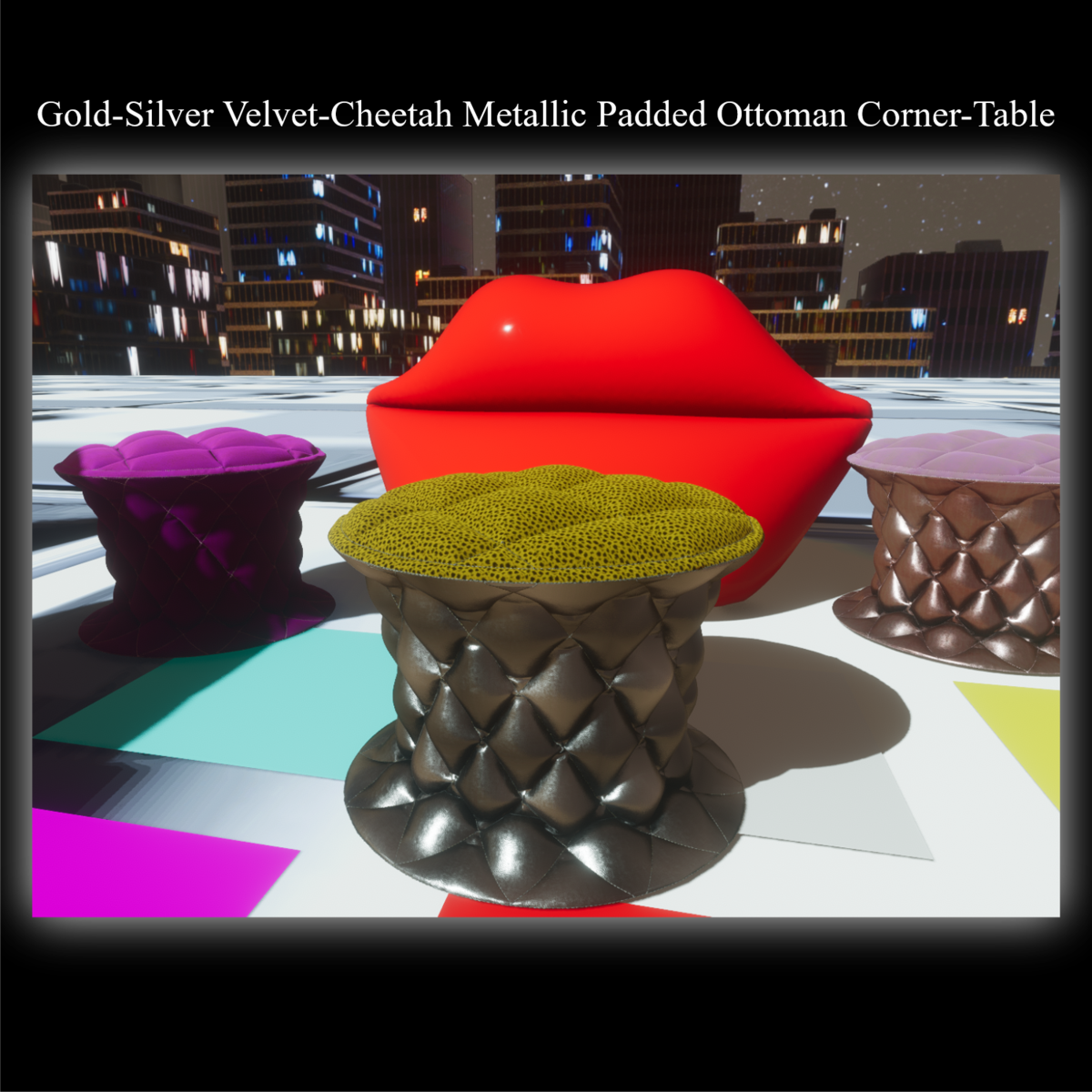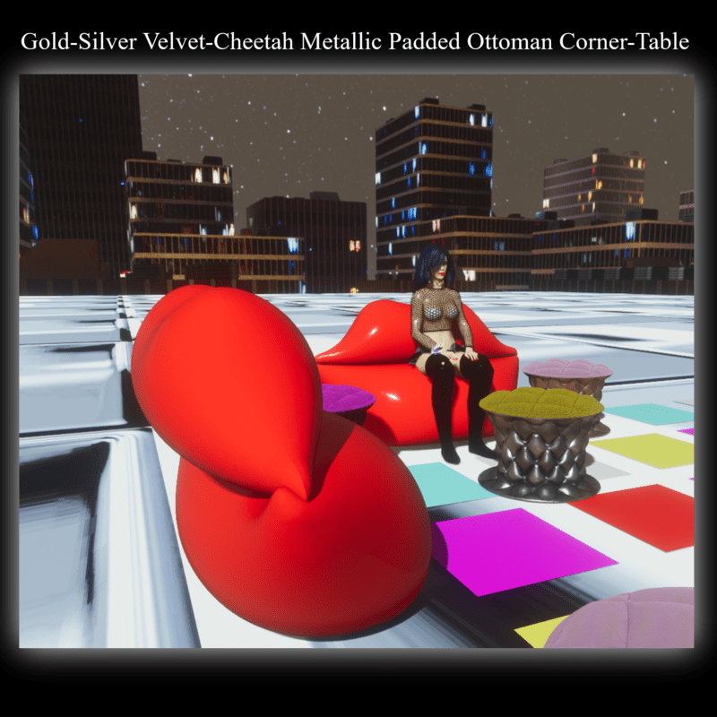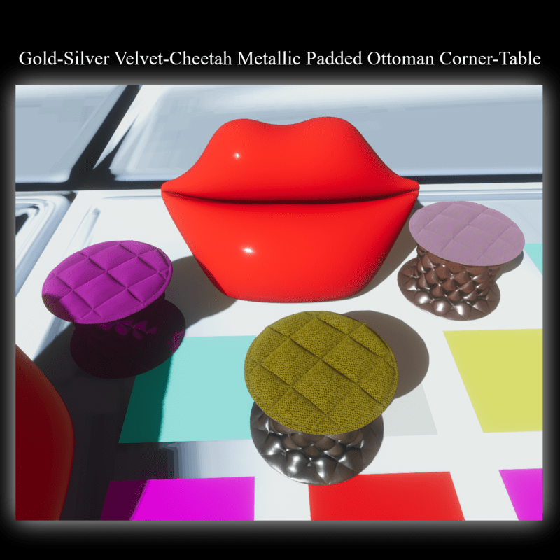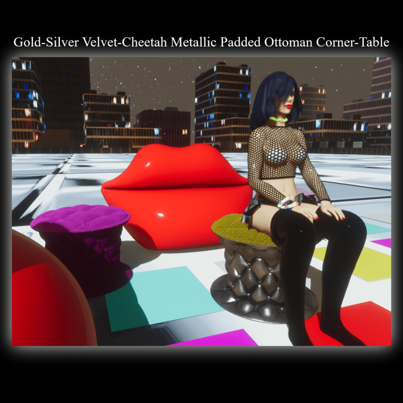 This sweet Padded Ottoman Corner-Table is cool with gold cheetah velvet top and silver leather metallic for modern apartments and classic places like castles & mansions etc. It comes with a seat point. Enjoy and have fun!