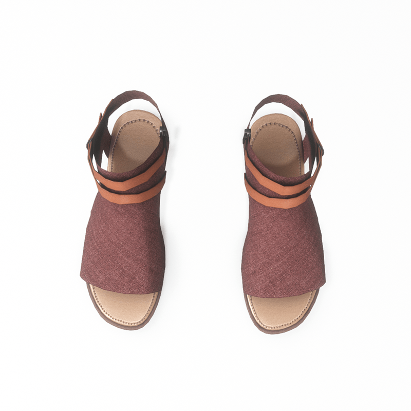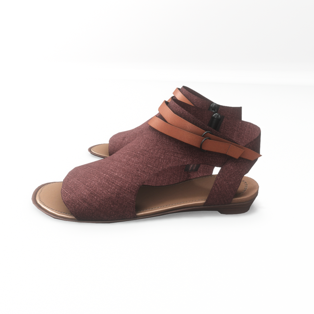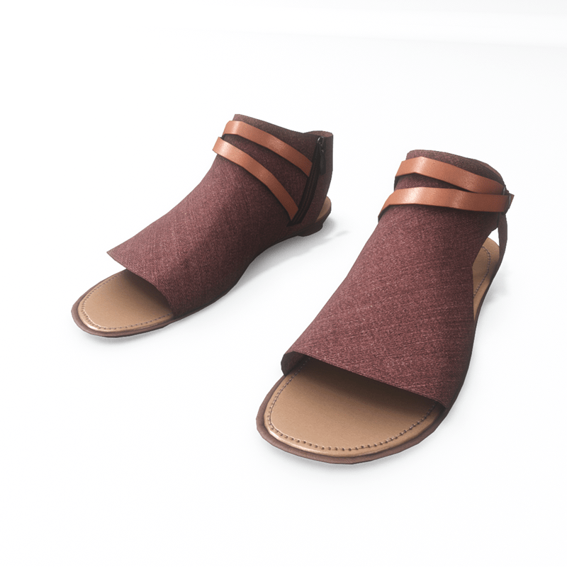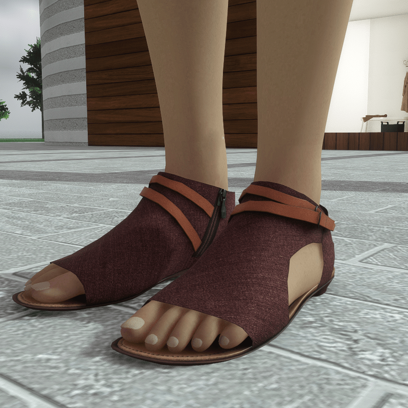 A modern pair of flat sandals made with burgundy - red denim fabric. The shoes have an inside zipper closure and decorative leather straps around the ankle. Get the free demo to check style and fitness before purchasing here: https://store.sansar.com/listings/068ce114-0610-4487-8dcf-405b6ba01511/av-20---open-toe-textile-sandals---demo