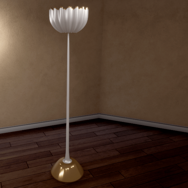 This is a floor lamp with gold borders and base. It's look like a shell or a flower. It is made with a collision shape. I've set the "Draw Distance Limit" to 32 meters. And you can resale it ! You can see them in Sansar here : https://atlas.sansar.com/experiences/morganeparis/made-in-paris For better render, put several light sources in your room. PS: This is the "not scripted" version, so you will receive 2 lamps : One with light on, and one with light off.