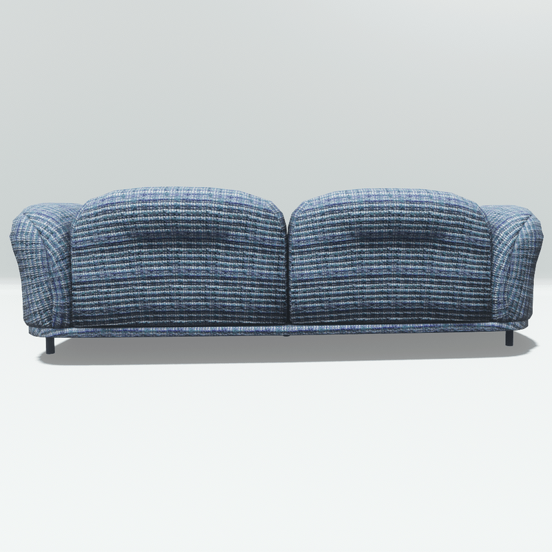Two-seater sofa with rounded corners and fabric upholstery in white and blue shades. It has three decorative cushions with a rounded shape. It has collision and editable materials. You can get a close look here: https://atlas.sansar.com/experiences/luise/studio-lamda