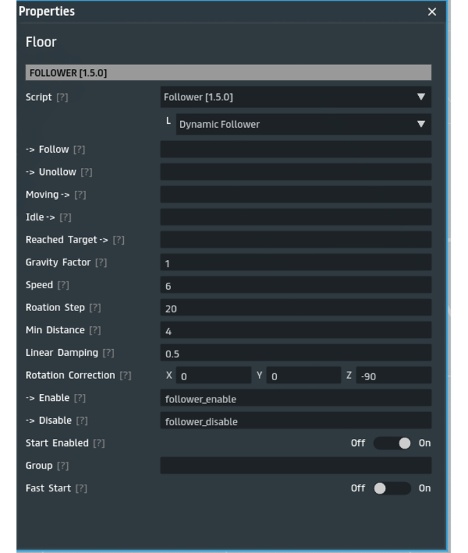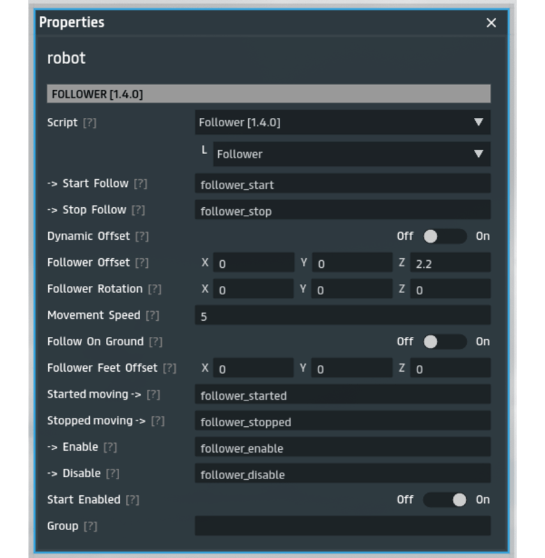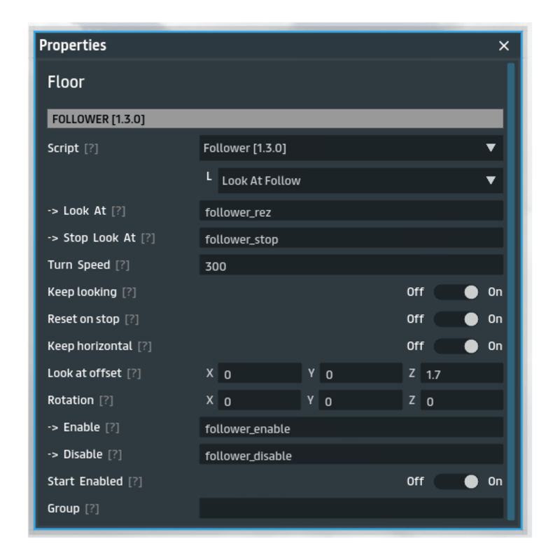 This script will make the object follow the user based on Script Library events. You place this script in the object you want to be the follower. It can simulate "walking" by sticking to the ground when it follows. The "meeting point" of the follower and user can be configured by a strict offset, or where ever the follower meets the offset distance. The object must be 'Movable by script'. Also included is a rotation only follow script. Updates: - 1.0.1 - fixed a critical bug that messes up the offset when defining a rotation, rotation should be applied to the object not the offset. - 1.0.2 - fixed offset and orientation not set correctly for specially crafted object models. - 1.1.0 - added 'Single Follower' script for allowing any object to follow the user, not just from a rezzer. - 1.2.0 - Changed code to use mover api. The object must be keyframed and have 'Movable by script' enabled. - 1.3.0 - Added 'Look At Follow' script that will make the object's direction follow the target. This does not work well with other scripts that move the object, it assumes the object is standing still. - 1.4.0 - bug fixes, added events for started/stopped following, removed 'Follower Rezzer' (not needed now with the regular follower script) - 1.5.0 - added dynamic physics follower script - 1.5.8 - bug fixes, added idle timeout event for detecting when the follower is stuck, added idle threshold speed. * I allow buyers to resell this script as part of their own products, but not as a standalone script
