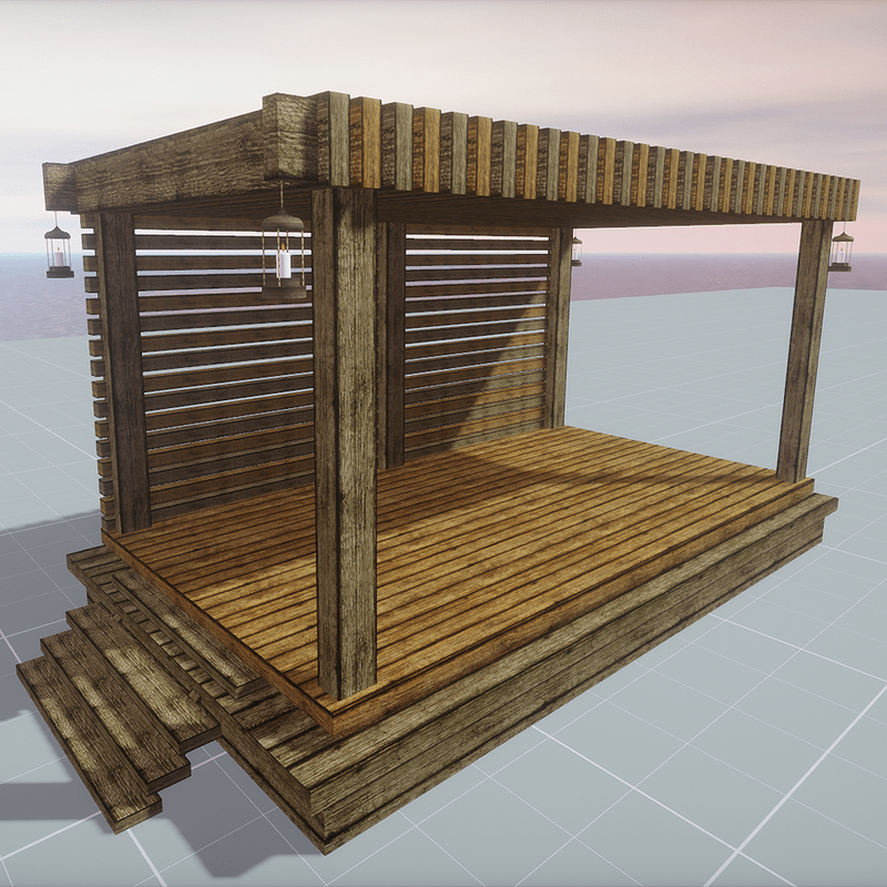 Beachside Pavillion - For use in beach, home, or garden settings! Deck has collision and is fully walkable. In order for lamps to glow you will need to at a light in Sansar. Item will be updated as more features are released in Sansar. You can see this item and others I have for sale on the Sansar Marketplace at https://atlas.sansar.com/experiences/alexxisdecuir/the-space-of-alexxis-decuir