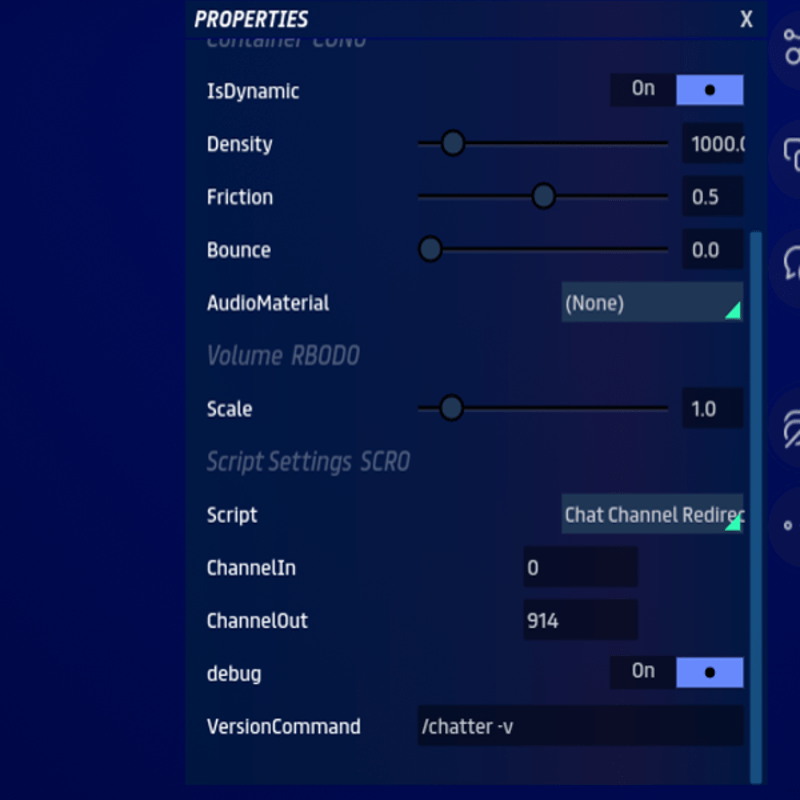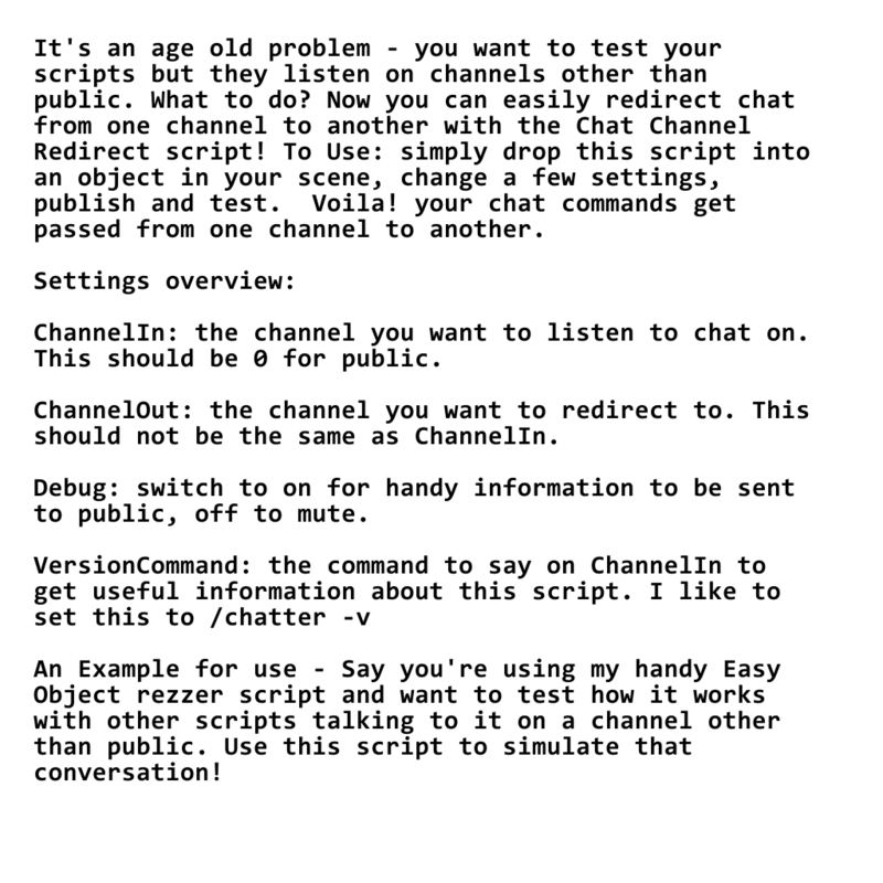 It's an age old problem - you want to test your scripts but they listen on channels other than public. What to do? Now you can easily redirect chat from one channel to another with the Chat Channel Redirect script! To Use: simply drop this script into an object in your scene, change a few settings, publish and test. Voila! your chat commands get passed from one channel to another. Settings overview: ChannelIn: the channel you want to listen to chat on. This should be 0 for public. ChannelOut: the channel you want to redirect to. This should not be the same as ChannelIn. Debug: switch to on for handy information to be sent to public, off to mute. VersionCommand: the command to say on ChannelIn to get useful information about this script. I like to set this to /chatter -v An Example for use - Say you're using my handy Easy Object rezzer script and want to test how it works with other scripts talking to it on a channel other than public. Use this script to simulate that conversation! Enjoy. Find @nebulae for support.