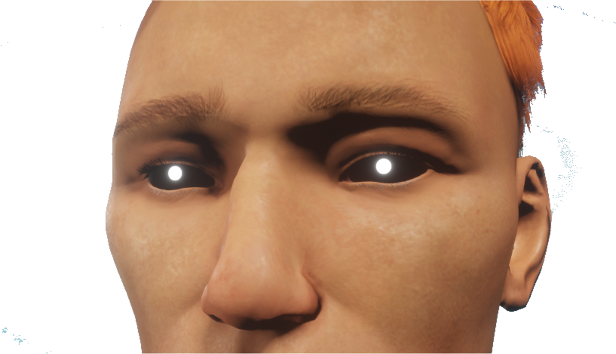 Black eyes with a white glowing pupil.