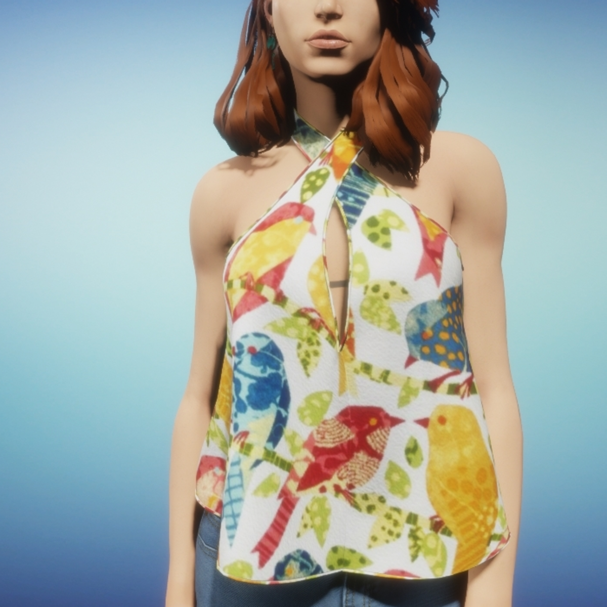 Draped top has pipping around the neckline and hem. Straps gently wrap around neck creating a deep V peek-a-boo neckline. It's best to wear this top and simulate cloth before wearing hair as the hair can affect the cloth around the neck as the cloth simulates. Remember you can always rewear the garment if you achieve an undesired effect while simulating the cloth. The bra strap does show in the back of the top. I'm hoping the strap will be removed by Linden Lab.