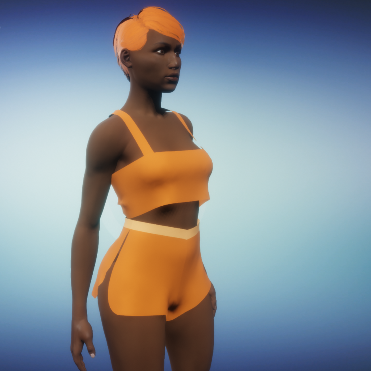 Soft orange top and bottom short set. To wear: Click the item in your inventory Click 'adjust' Wait for item to adjusy The clothing will move into place. DON'T click the item unless you want to change the look of your clothing placement (example: taking a strap off the shoulder). If the item gets too out of place, remove the item and start again.