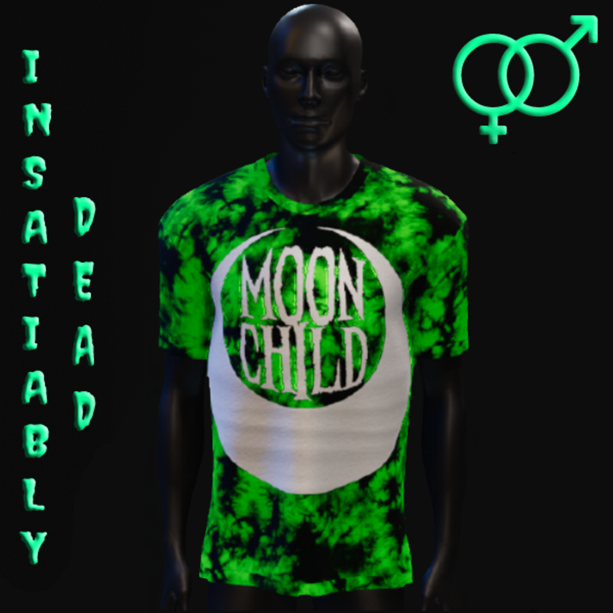 FOR ALL THE GHOULS AND GALS. UNISEX "MOON CHILD" T-SHIRT DARK TIE DYE [BLACK/GREEN]. CREATED IN MARVELOUS DESIGNER WITH AVATAR 2.0. ADJUSTMENT MAY BE REQUIRED! FITTING INSTRUCTIONS CAN BE FOUND BY GOING TO THE LINK BELOW. https://help.sansar.com/hc/en-us/articles/115005693363-Fitting-Marvelous-Designer-clothing-to-your-avatar PLEASE RATE AFTER BUYING! IF ANY ISSUES OCCUR PLEASE CONTACT TEAGAN BROKKEN FOR ASSISTANCE. THANK YOU! <3 <3 GET INSATIABLY DEAD <3