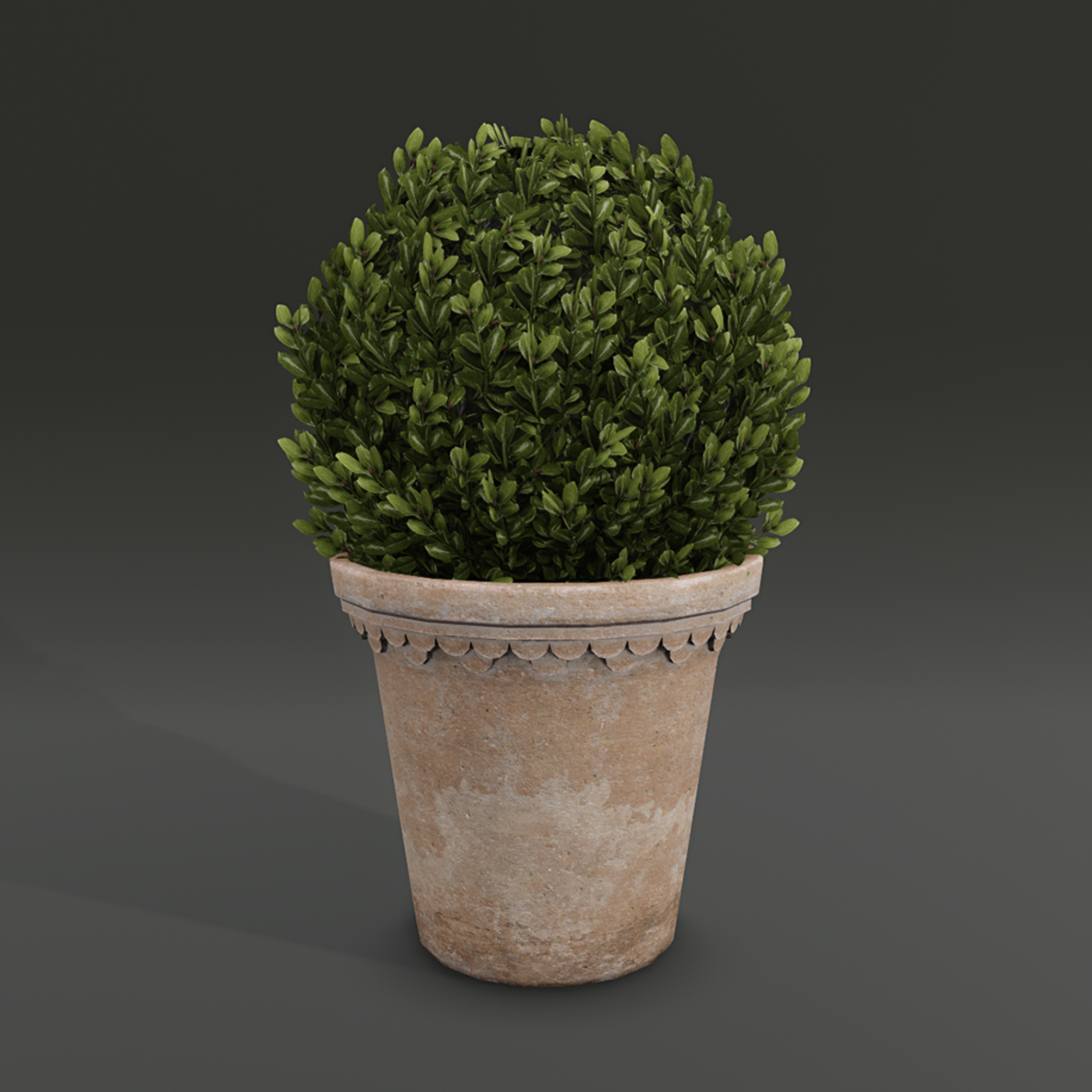 A trimmed boxwood topiary presented in a patina terracotta planter.