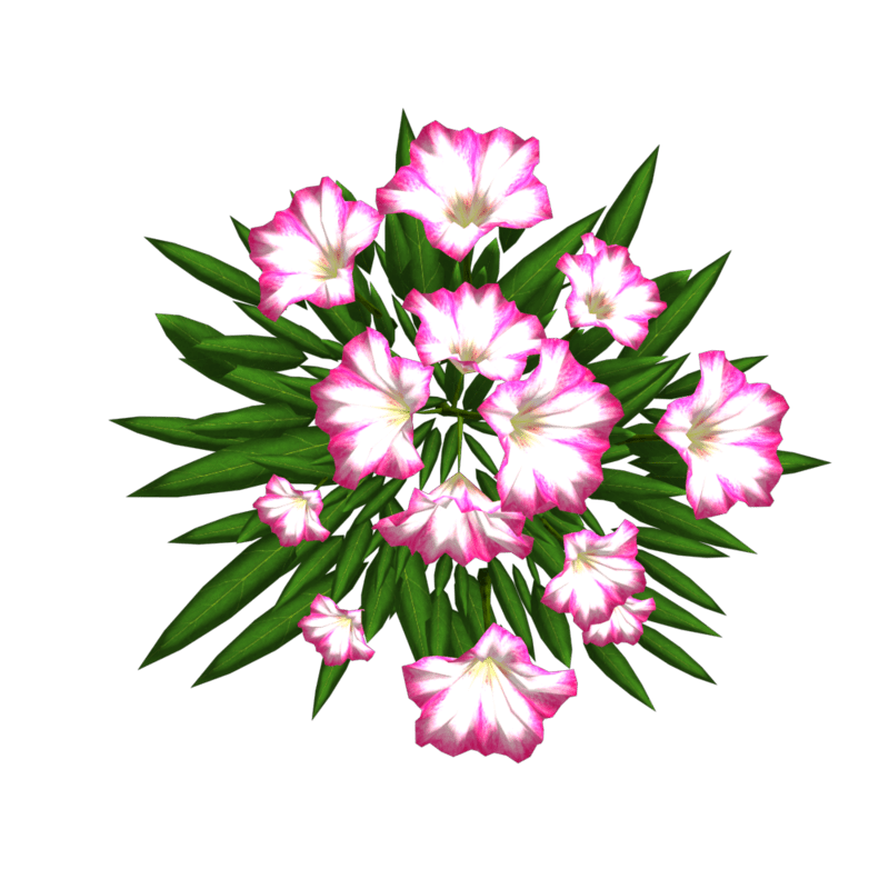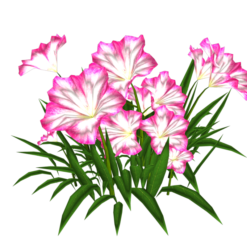 Petunias. I made many colors. There is no collision on this mesh so you can walk through it. To see it in Atlas, please visit "LovedWarrior's Ground Plants: https://atlas.sansar.com/experiences/lovedwarrior/lovedwarrior-s-ground-plants" Each petal, pollen, stalk and leaf is made by hand and placed by hand. All the textures are also made by me. Enjoy!