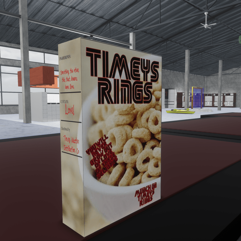 Timey's Rings for you kitchen. enjoy munching on Timey's Rings in the morning!! (made of Oats contains no Timey!!) To see this in world visit my store https://atlas.sansar.com/experiences/timeymaster-3376/timey-master-s-store