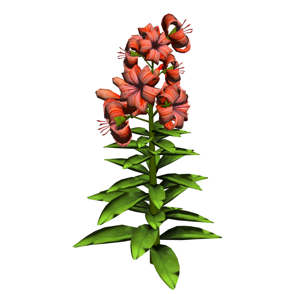 1 Tiger Lily Plant with about 10 blooming lily flowers and 6 buds and several leaves for your lovely gardens. Polygon count: 6546. There is no collision on this mesh so you can walk through it. I have many colors. To see this flower in Atlas, please visit "LovedWarrior's Ground Plants: https://atlas.sansar.com/experiences/lovedwarrior/lovedwarrior-s-ground-plants" Please note that all my flowers are 100% detailed mesh meaning no flat planes with flower pictures pasted on them. Each petal, pollen, stalk and leaf is made by hand and placed by hand. I only make grass from planes with grass pics pasted on them. All the textures are also made by me. If you have any flower or plant requests, show me a picture of the flower and I will let you know if I can make it for you. Enjoy!