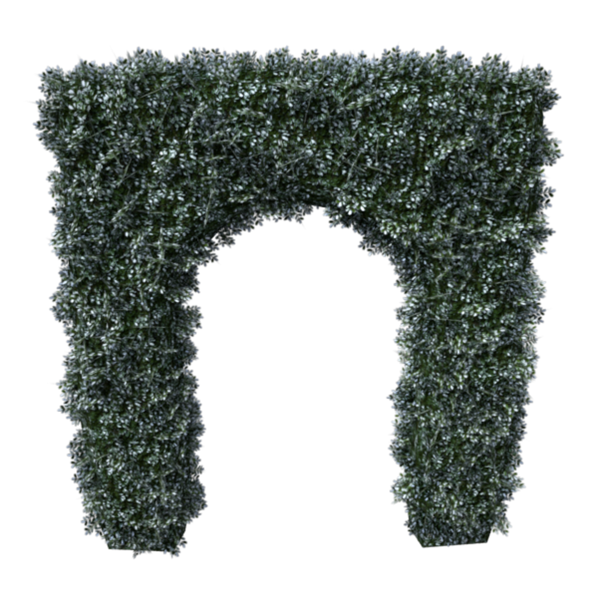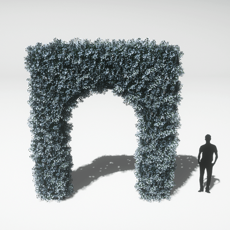 An English Boxwood hedge archway with dark green leaves dusted with snow. Opacity mapped textures are used for base and leaves. Approximately 4m wide, 1m deep and 6m tall. 3156 triangles.