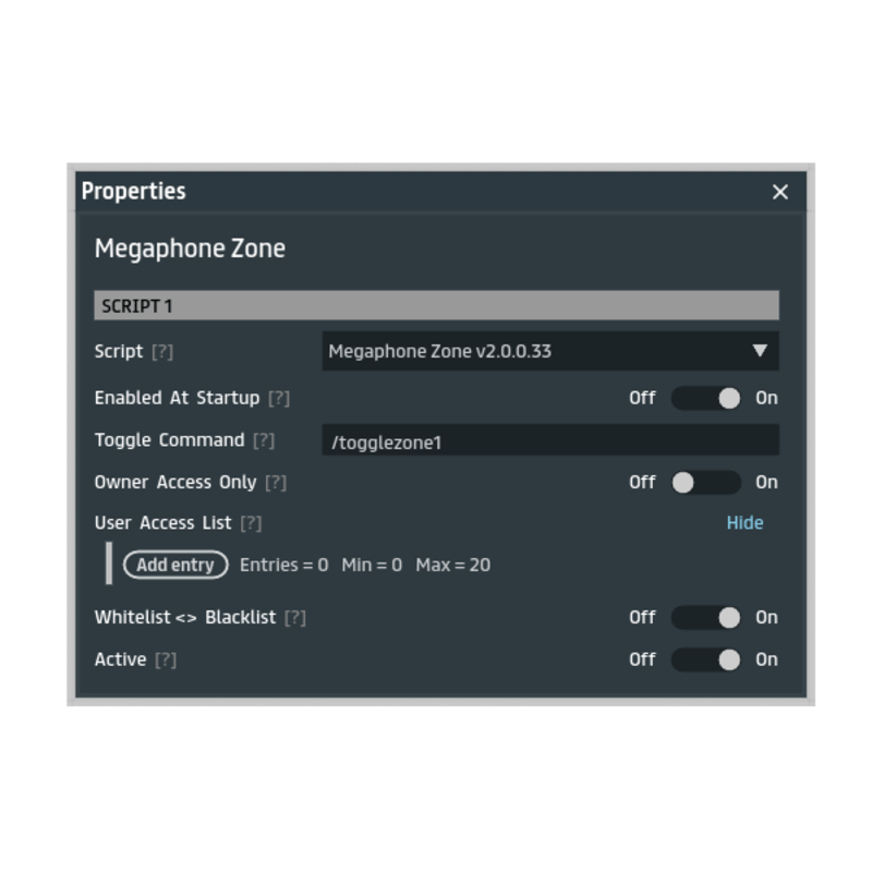 Enables the megaphone of a user when inside a trigger volume. ____________________________________________________________ ** Instructions ** Drop this script in a Trigger Volume and change the settings to fit your needs. ** Settings ** - Enabled At Startup: whether or not to start enabled when the experience loads. If you turn this off you will have to manually enable the functionality by using the toggle command. - Toggle Command: chat command for the experience owner to enable/disable the script functionality. - Owner Access Only: limit interaction with the object to the experience owner only. Turning this on will ignore the User Access List. - User Access List: list of user handles (@name) to which the permission filter applies. - Whitelist <> Blacklist: determines whether the permission filter grants access (whitelist) or denies access (blacklist) to the User Access List. - Active: toggles the script on or off. ** Changelog ** v2.0.0.33 (2022-09-07) - Revised code v1.1.0.31 - Updated Avatar Access List with new editable list property. - Added switch to toggle between whitelist and blacklist. ** Questions, issues or suggestions? ** Contact @Tron-Sansar