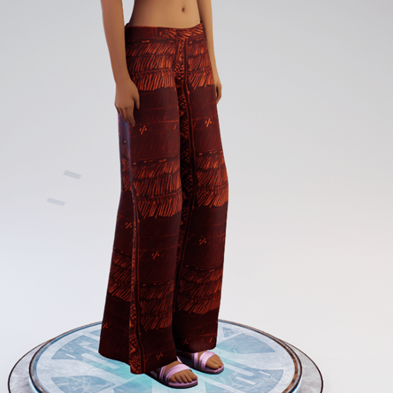 Snug fit at hips, loose and wide legs. Made to work with sandals or barefoot. Walks well. Please try demo.