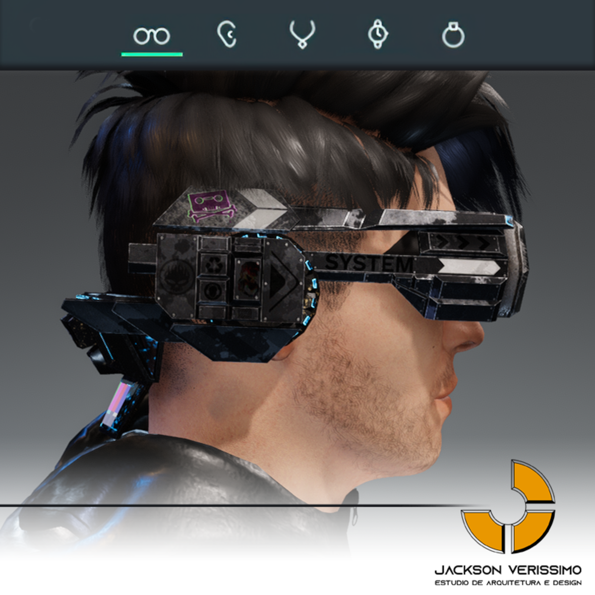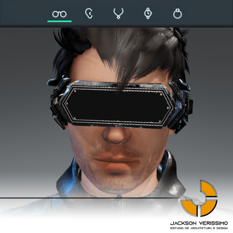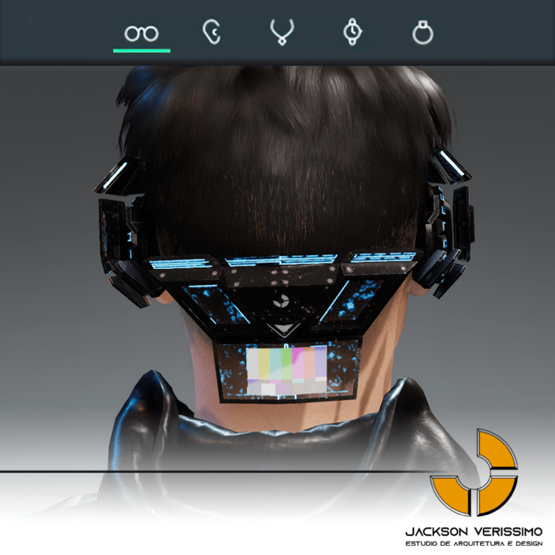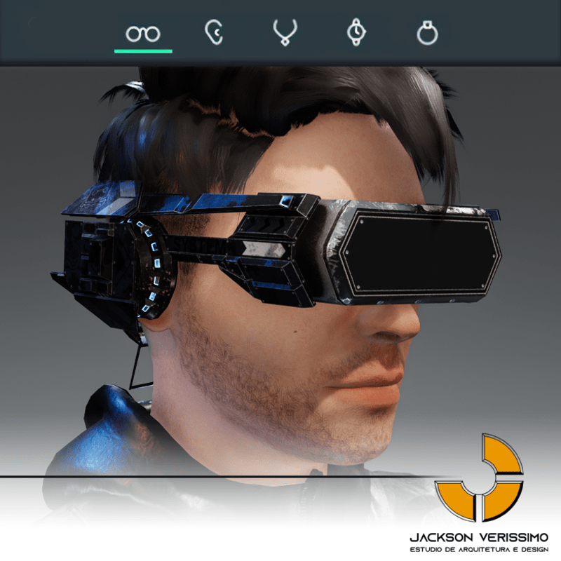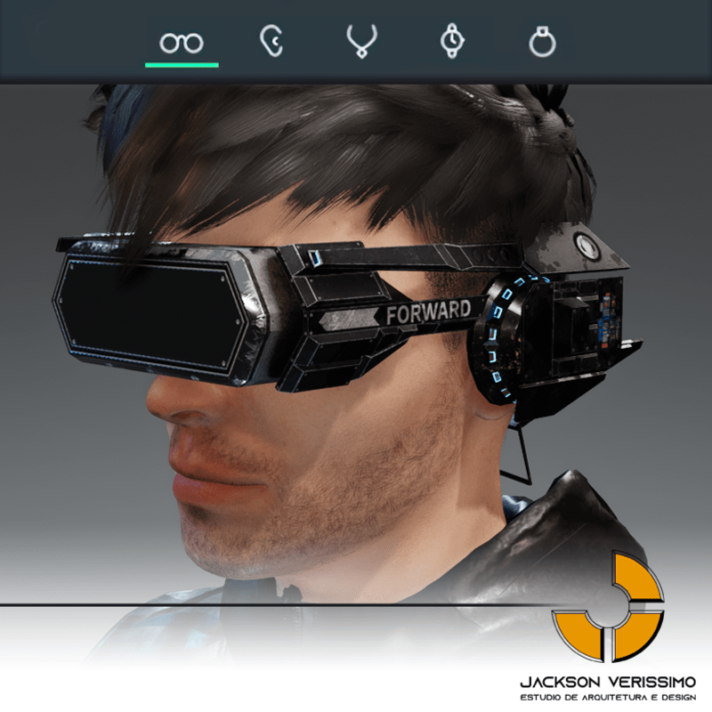 Visionary Design for a VR Headset exclusive for the Sansar Metaverse. Special and High Quality Texture. Vr glasses with headphones, Emissive lights and Media Screen. Unisex. Matches with all humanoid avatars. No need for adjustments for the default 2.0 Avatar of Sansar.
