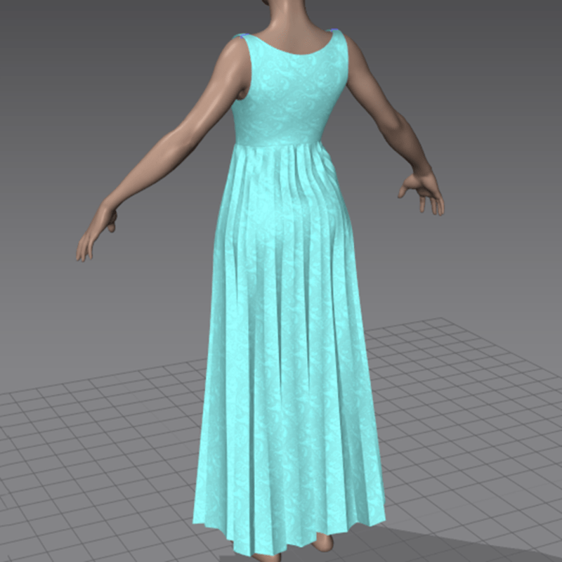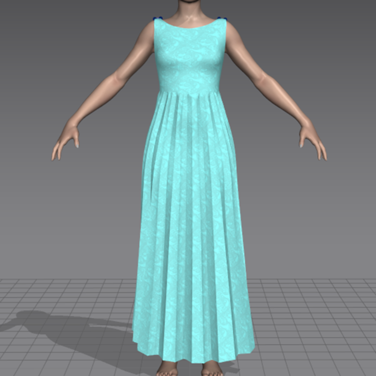 A 1963 evening dress, featuring a brocaded aqua fabric, pleated skirt and ankle-length hemline. Elegant and flowing.